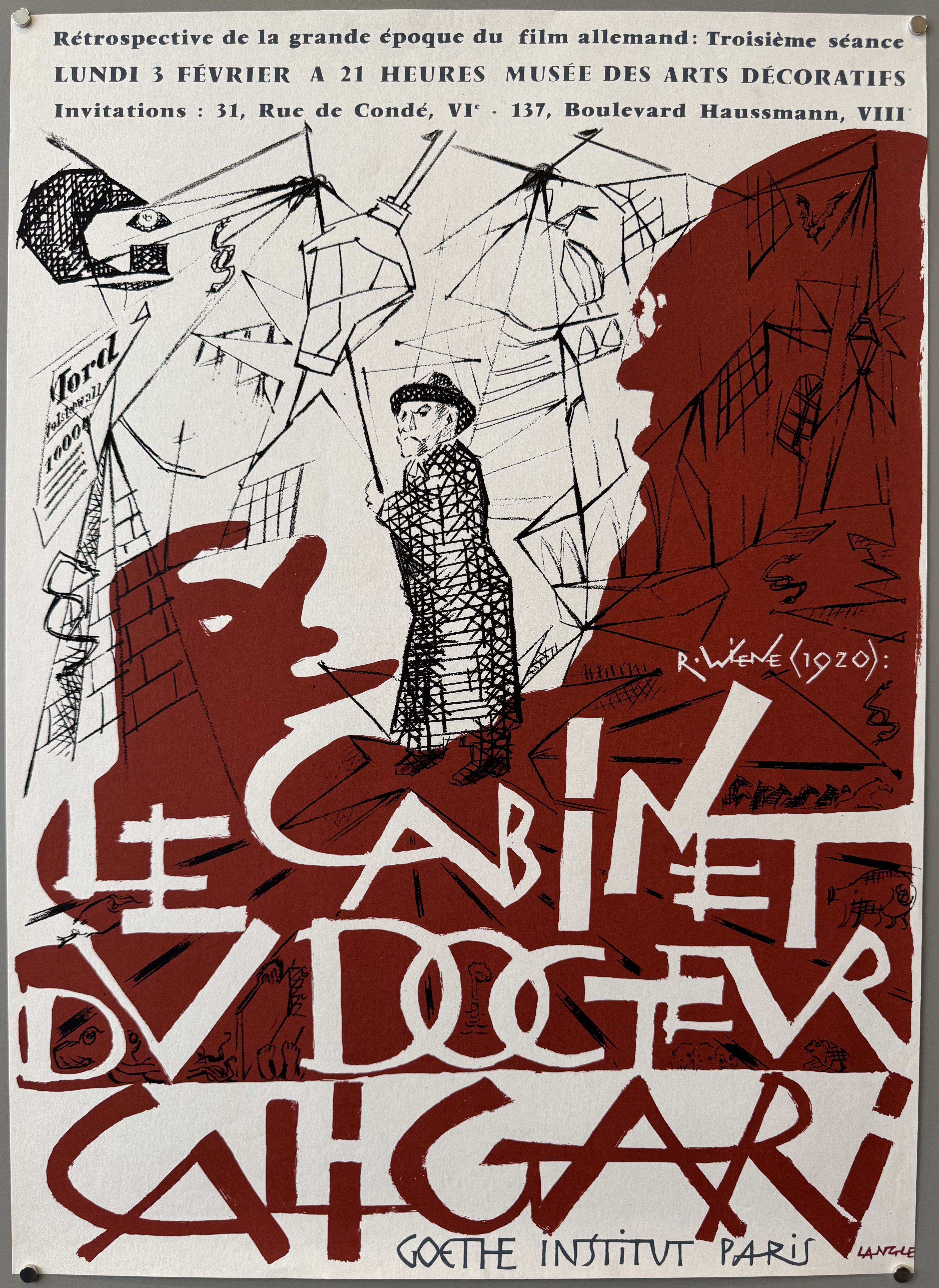 French poster advertising a screening of the classic German silent film, The Cabinet of Dr. Caligari, directed by Robert Wiene in 1920. Presented by the Goethe Institut, Paris at the Musée des Arts Décoratifs.