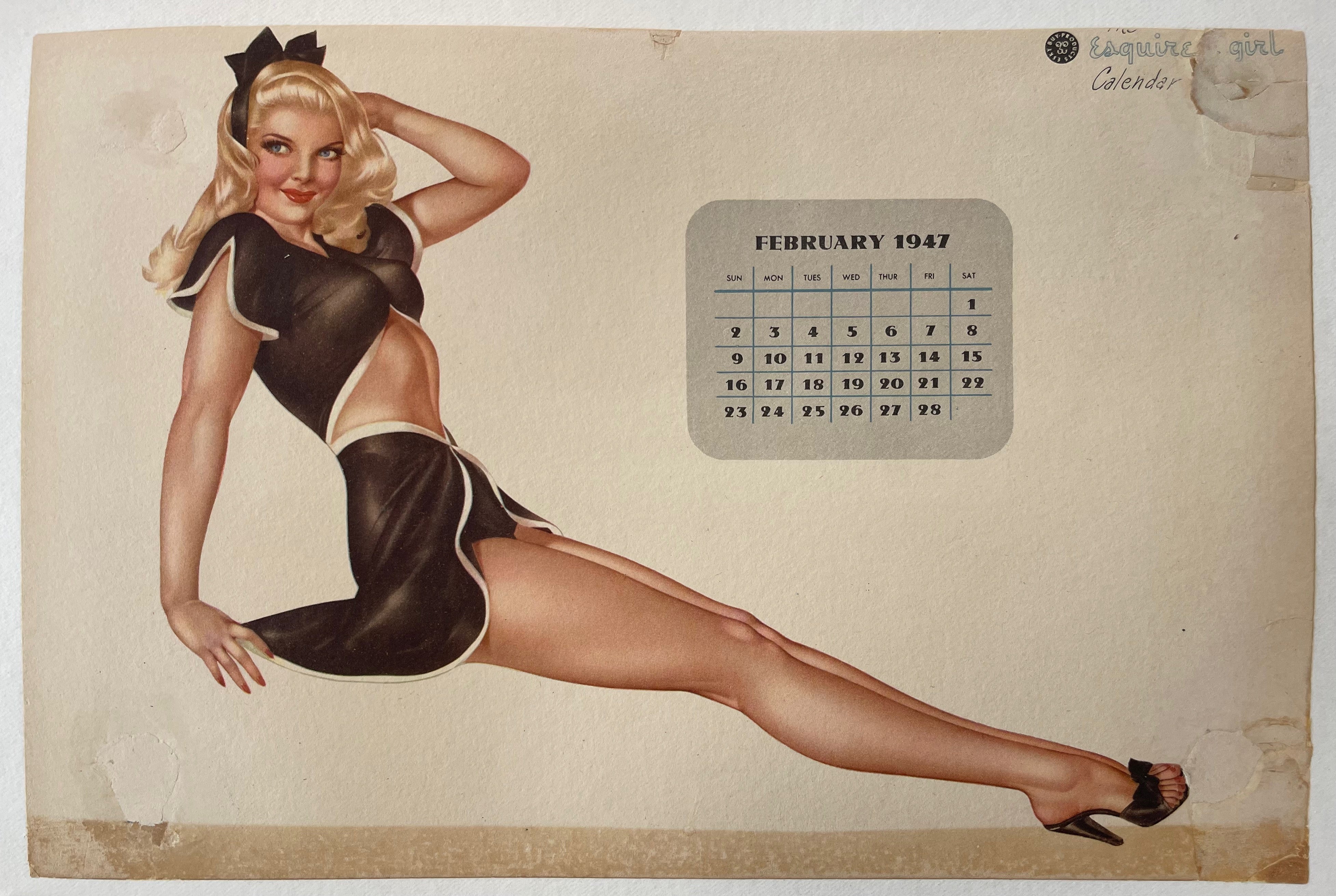 This vintage print showcases a beautiful woman sitting with her legs outstretched under a February 1947 calendar as part of Esquire's annual 'Esquire Girl' Calendar series. 1947 was the last year artist Alberto Vargas completed illustrations for the company after a lengthy legal battle.