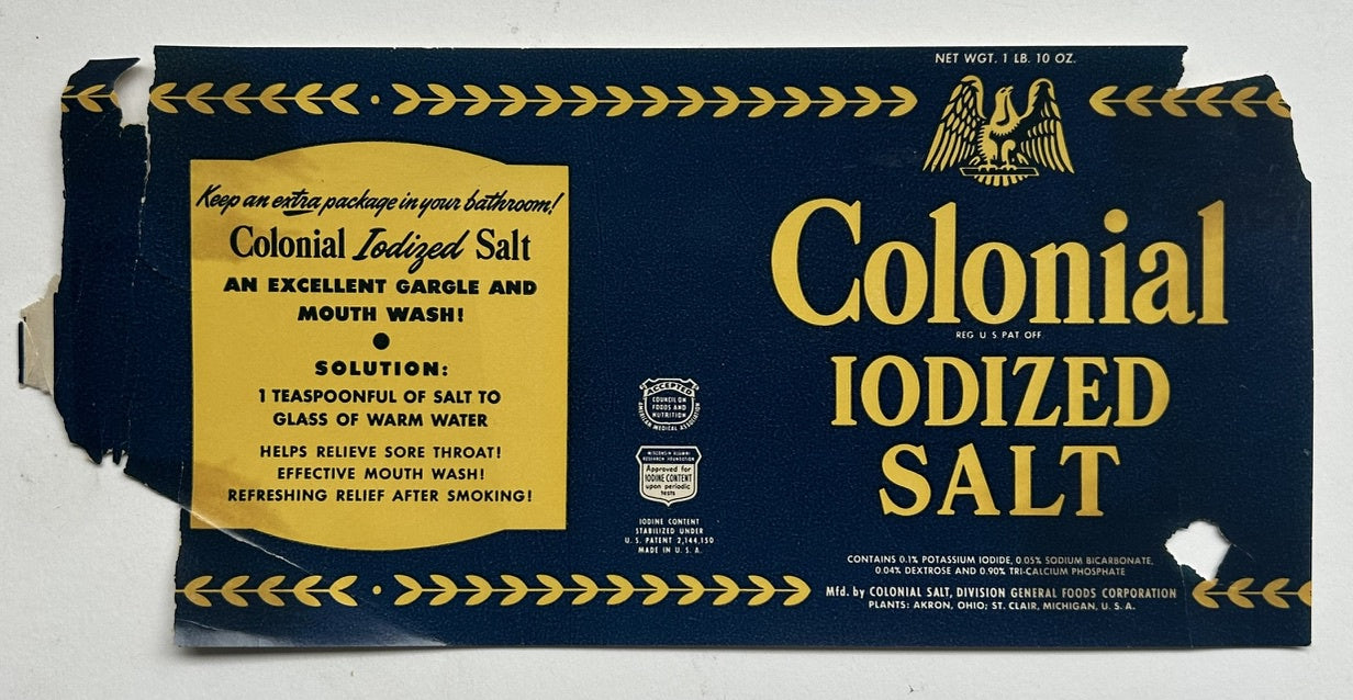 "Colonial Iodized Salt/ Keep an extra package in your bathroom!/ Colonial Iodized Salt/ An excellent gargle and mouth wash!/ Solution: 1 teaspoonful of salt to a glass of warm water/ Helps relieve soar throat! Effective mouthwash! Refreshing relief after smoking! "