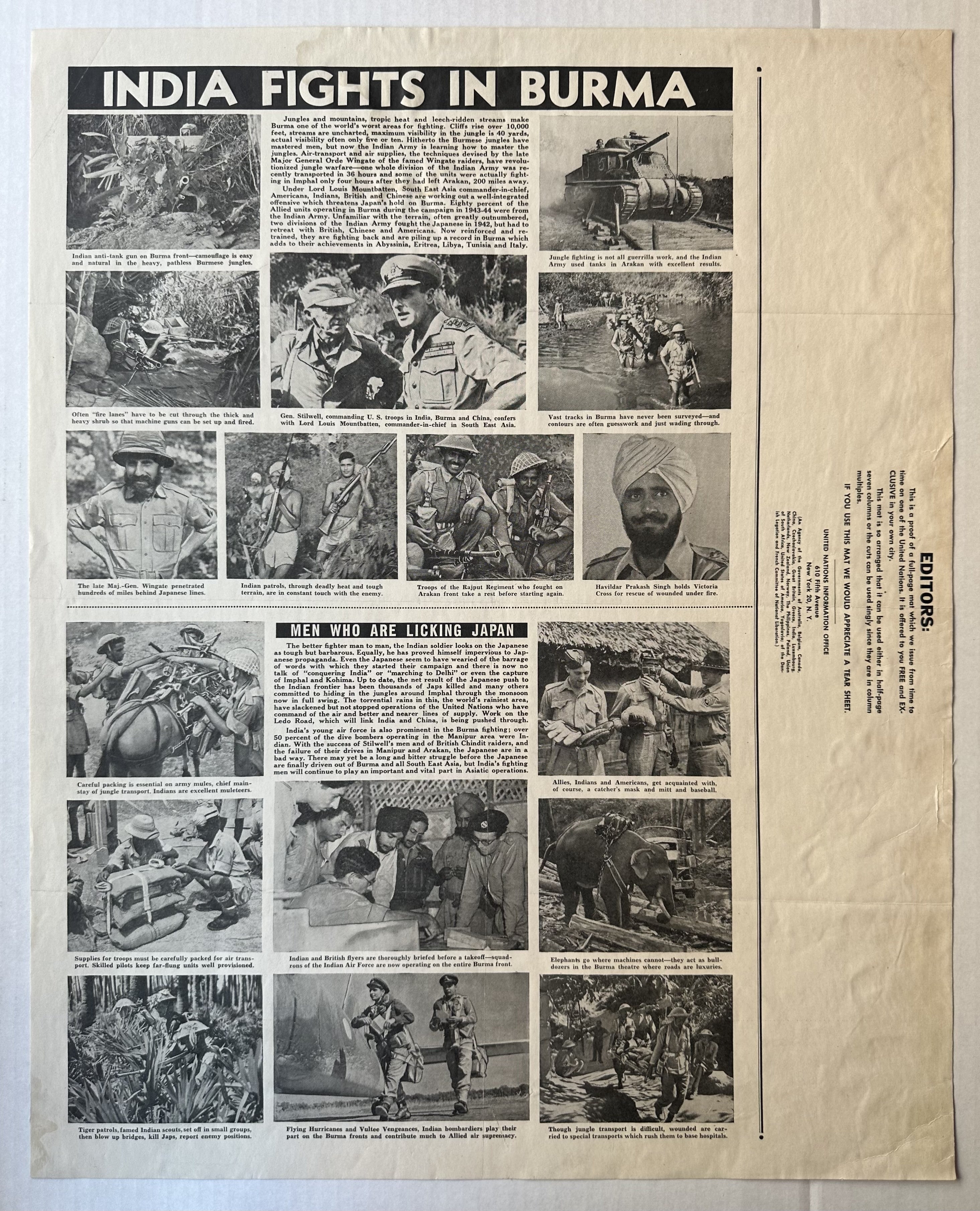 "INDIA FIGHTS IN BURMA / Jungles and mountains, tropic heat and leech-ridden streams make Burma one of the world's worst areas for fighting. Cliffs rise over 10,000 feet, streams are uncharted, maximum visibility in the jungle is 40 yards, actual visibility often only five or ten. Hitherto the Burmese jungles have mastered men, but now the Indian Army is learning how to master the jungles. Air-transport and air supplies, the techniques devised by the late Major General Orde Wingate of the famed Wingate raiders, have revolutionzied jungle warfare--one whole division of the Indian Army was recently transported in 36 hours and some of the units were actually fighting in Imphal only four hours after they had left Arakan, 200 miles away..."