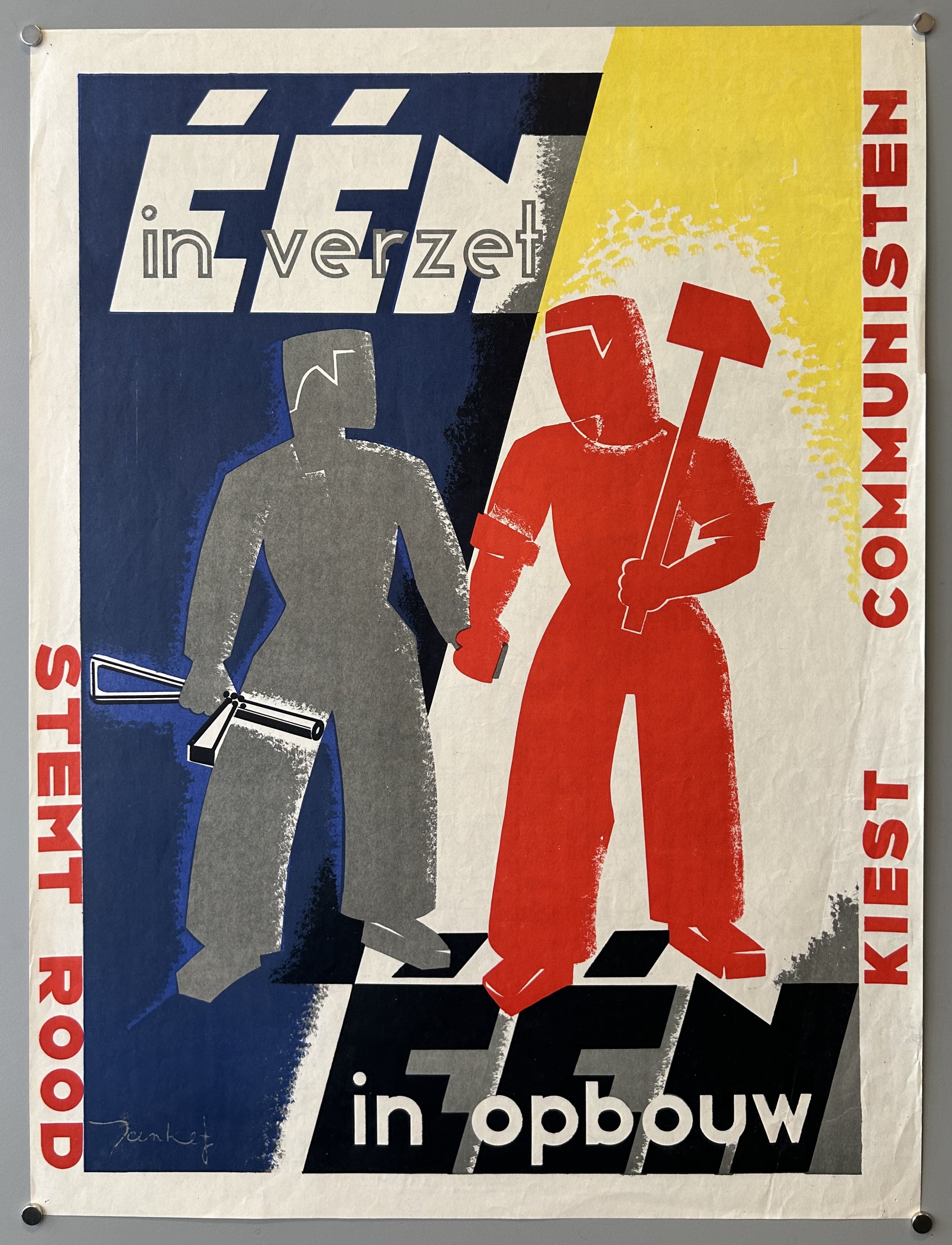 "Een in verzet. Een in opbouw. Kiest communisten. Stemt rood." (One in resistance. One under construction. Elects communists. Votes red.)