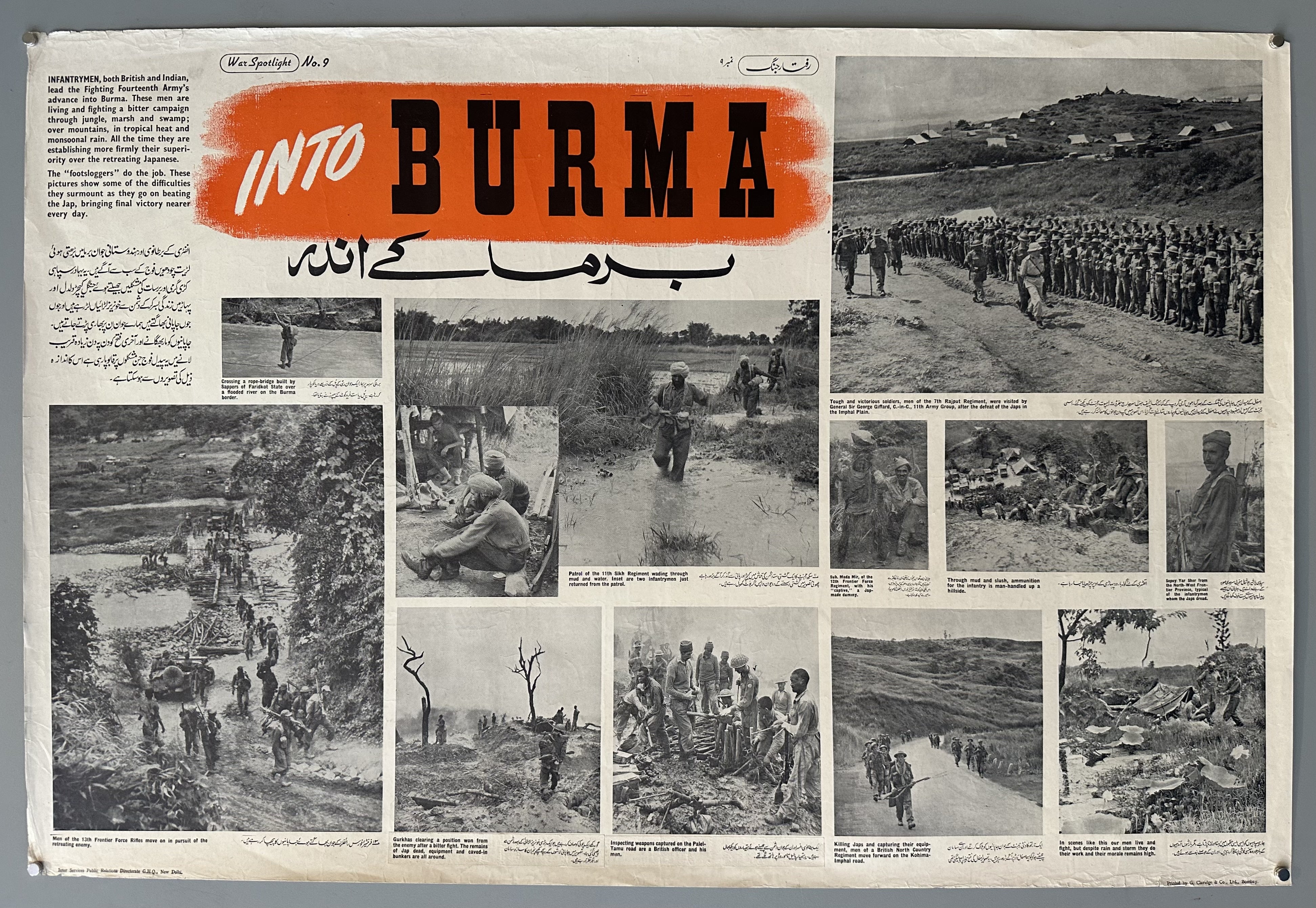 "INTO BURMA / Infantrymen, both British and Indian, lead the Fighting Fourteenth Army's advance into Burma. These men are living and fighting a bitter campaign through jungle, marsh and swamp; over mountains, in tropical heat and monsoonal rain. All the time they are establishing more firmly their superiority over the retreating Japanese. The "footsloggers" do the job. These pictures show some of the difficulties they surmount as they go on beating the Jap, bringing final victory nearer every day."