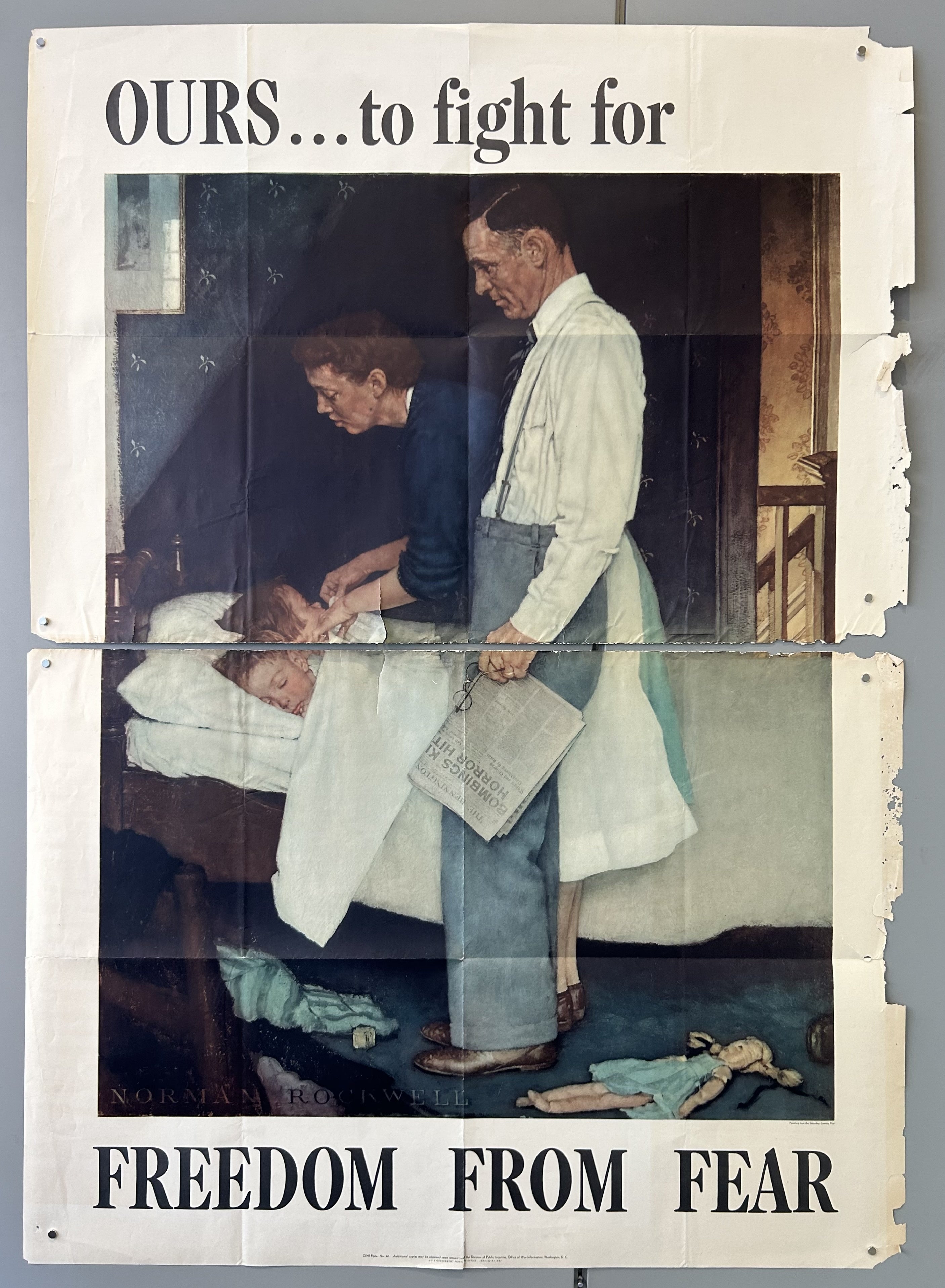 This poster was commissioned by the Office of War Informations, the imagery originating from the Saturday Evening Post. Part of Norman Rockwell's "Four Freedoms" painting series. The 1943 paintings are inspired by the 1941 State of the Union address by President Franklin D. Roosevelt, in which he outlined four democratic values that he considered essential to preserve: freedom of speech, freedom of worship, freedom from want, and freedom from fear. Rockwell utilized this speech after the United States entered World War II, as support for war efforts.