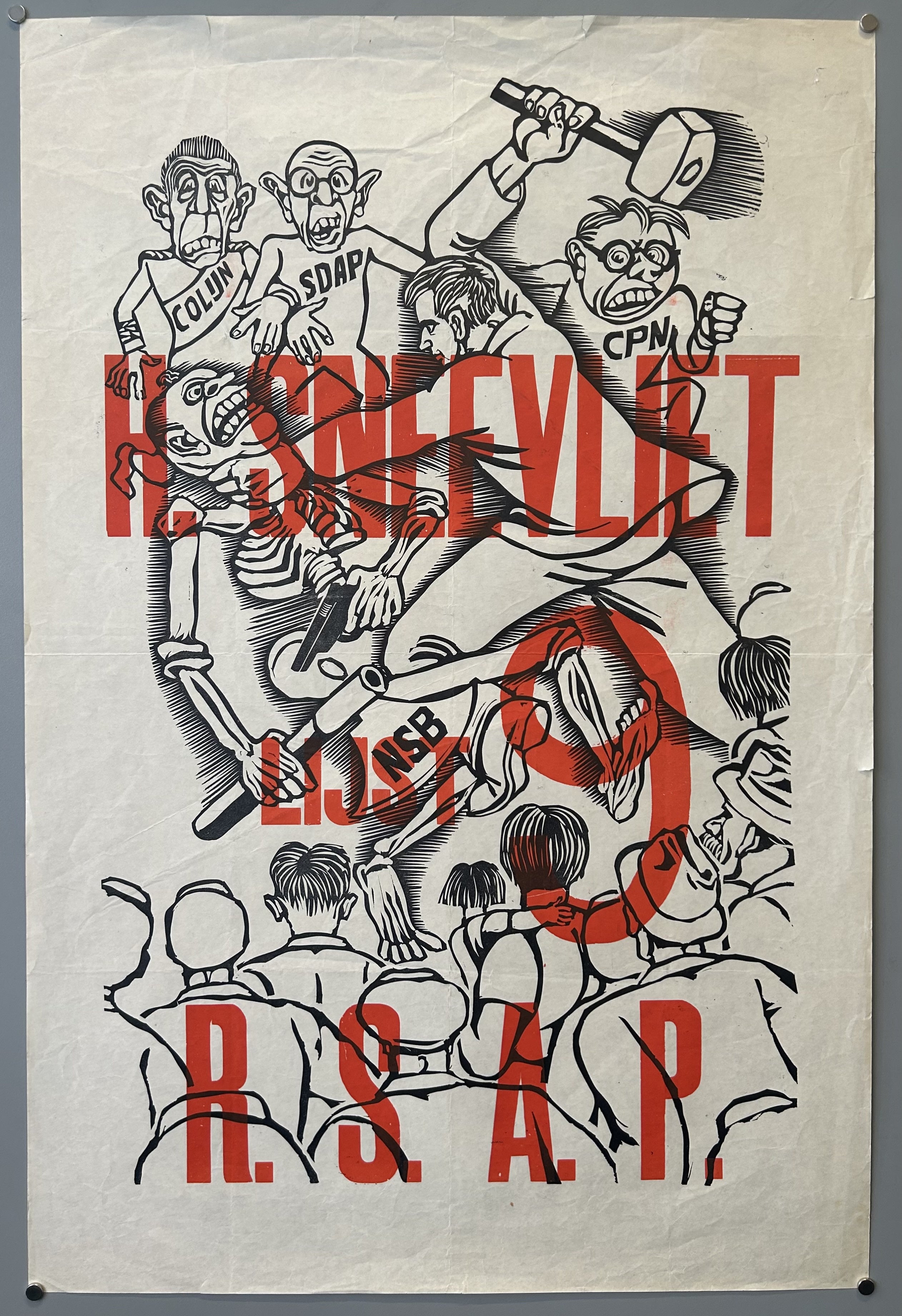 Poster produced by the Dutch R.S.A.P. (Revolutionary Socialist Party) in promotion of the founder, Henk Sneevliet, a Dutch communist politician who guided the formation of both the Communist Party of Indonesia in 1914, and the Chinese Communist Party in 1921. He took part in the Communist resistance against the occupation of the Netherlands during World War II and was executed by the Germans 1942.