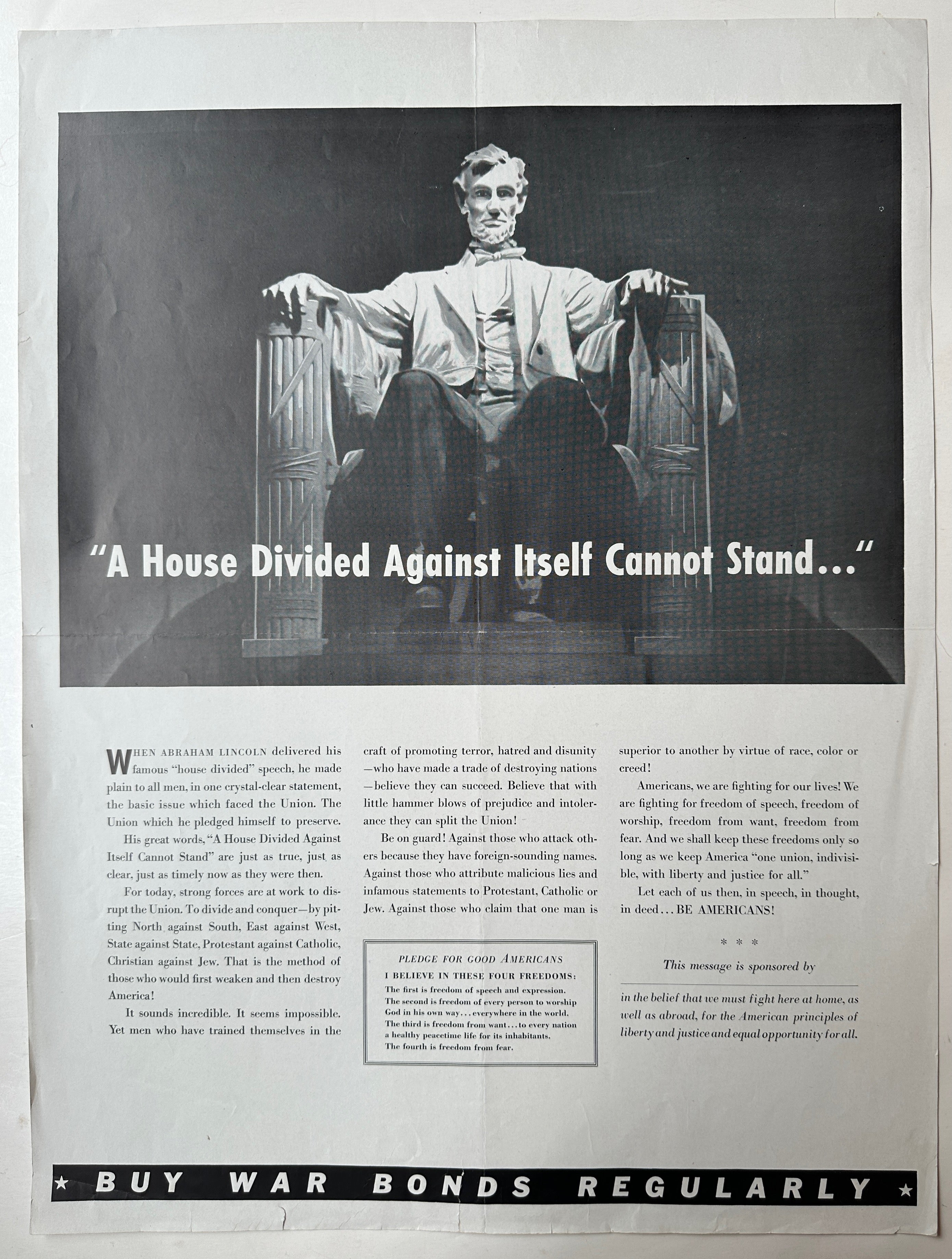 World War II-era war bond poster using Abraham Lincoln's famous quote "A house divided against itself cannot stand..." to advocate for American solidarity within the nation, for support and tolerance of people with different backgrounds. Poster includes black and white portrait of Lincoln with quote in white text, as well as a longer text below advocating for a more united America.