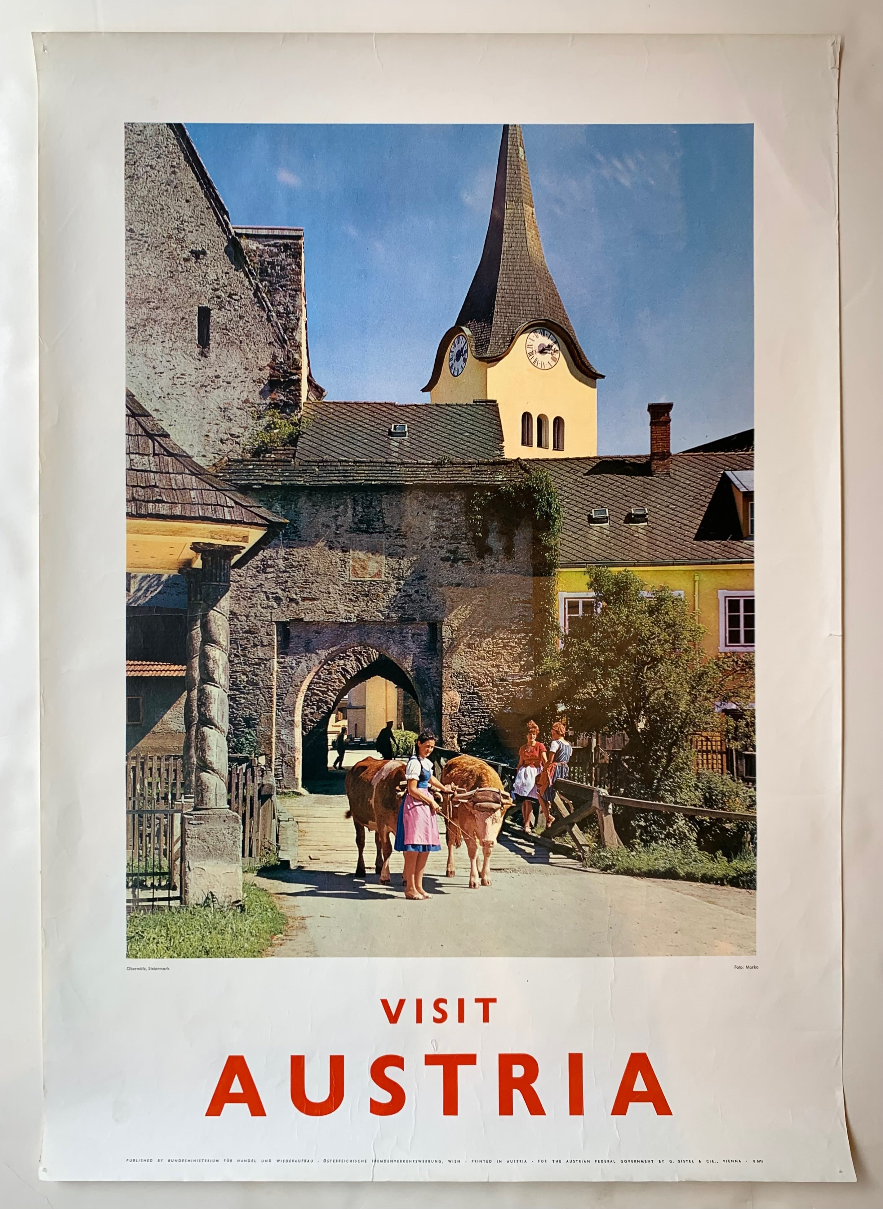 Vintage travel poster of Oberwölz Stadt, a town and a former municipality in the district of Murau in the Austrian state of Styria. The poster features a colored photograph of a girl leading two oxes.