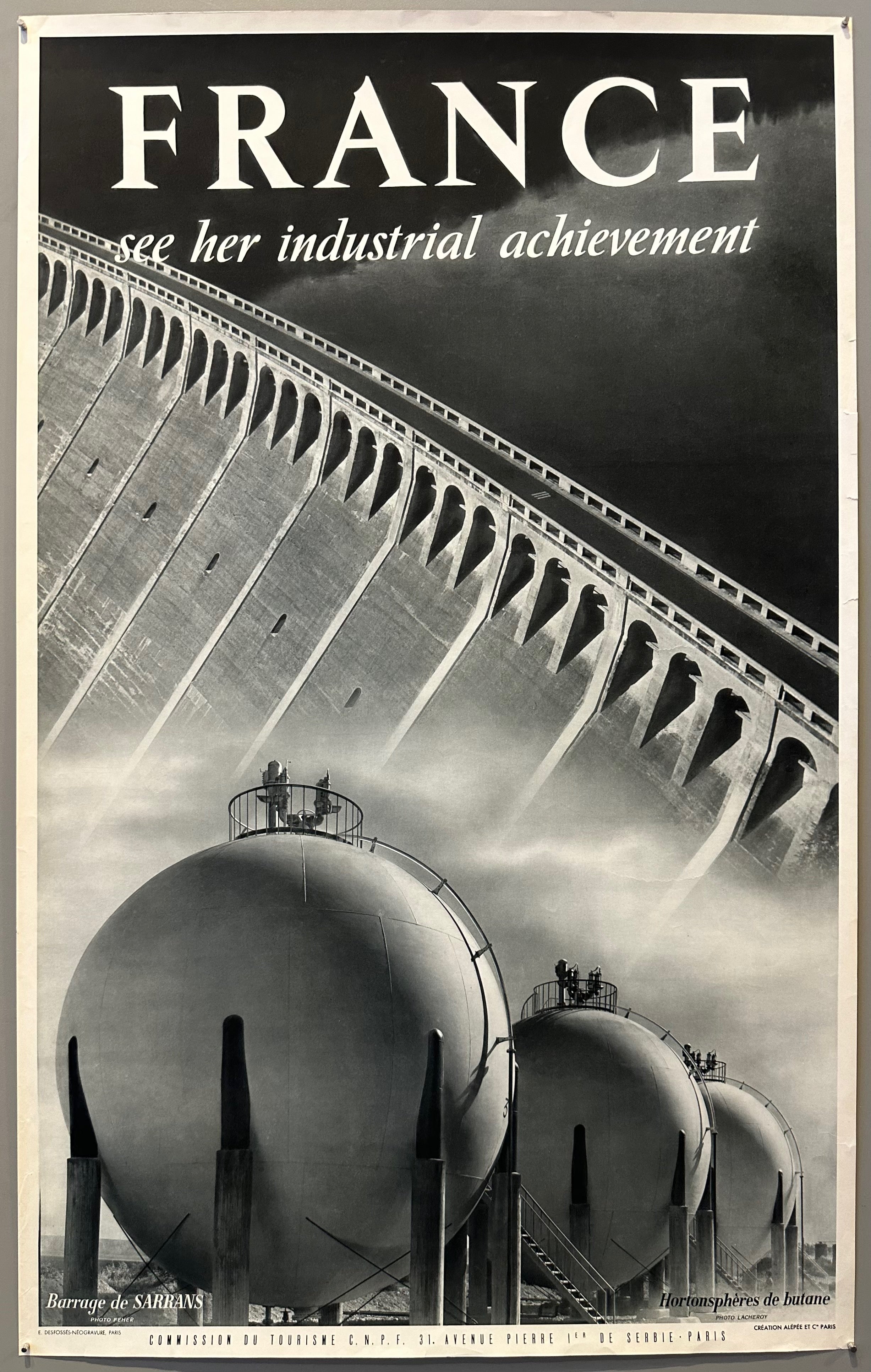 A vintage travel poster featuring two black-and-white photographs overlapped of 'Le barrage de Sarrans' (Sarrans Dam) and Horton spheres filled with butane.