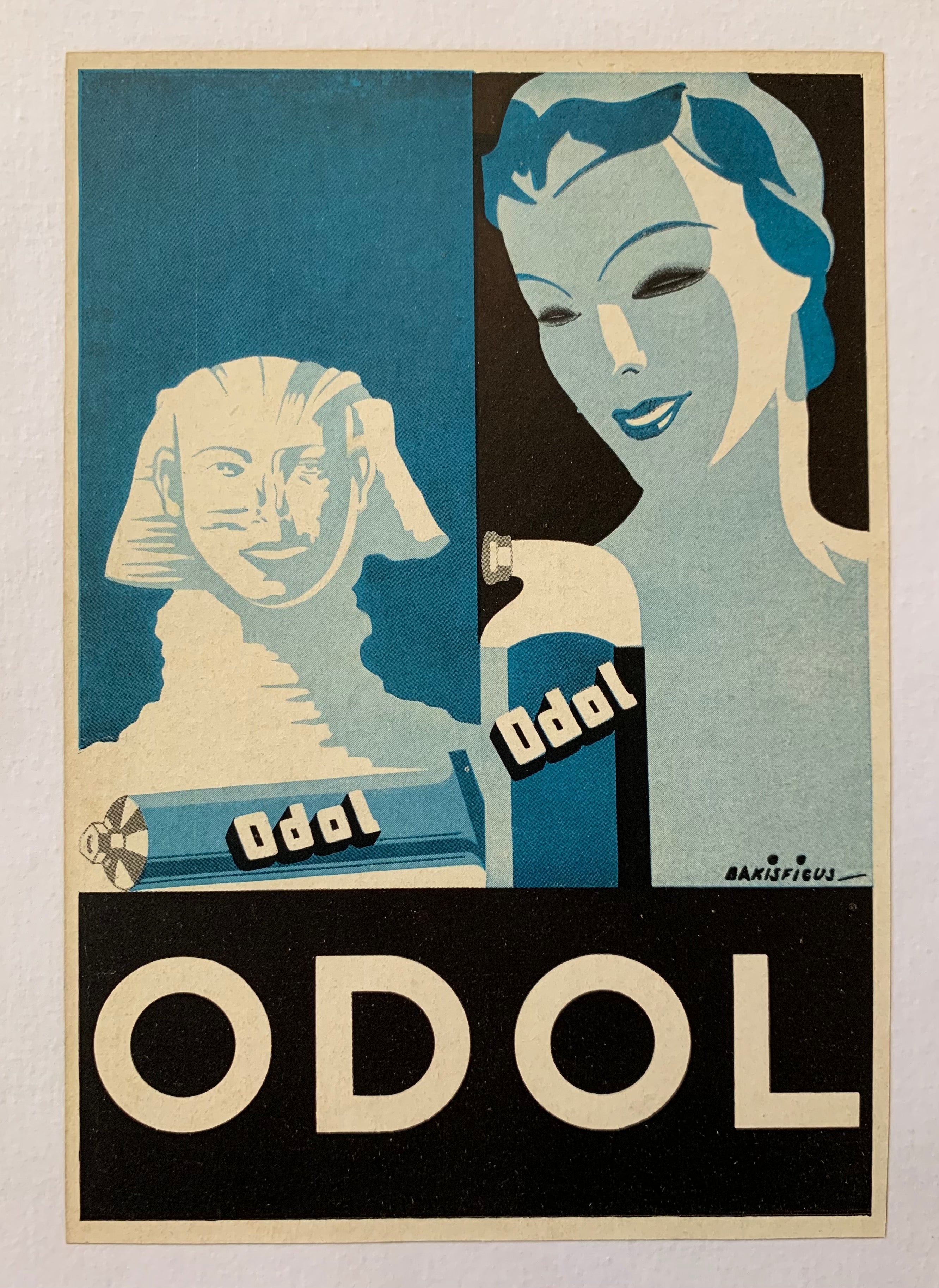 In this chic blue-toned poster for ODOL Toothpaste, a woman smiles pleasantly beside a bottle of ODOL mouthwash and toothpaste. In all cool blue tones, this poster captures the minty-freshness ODOL provides to its customers.