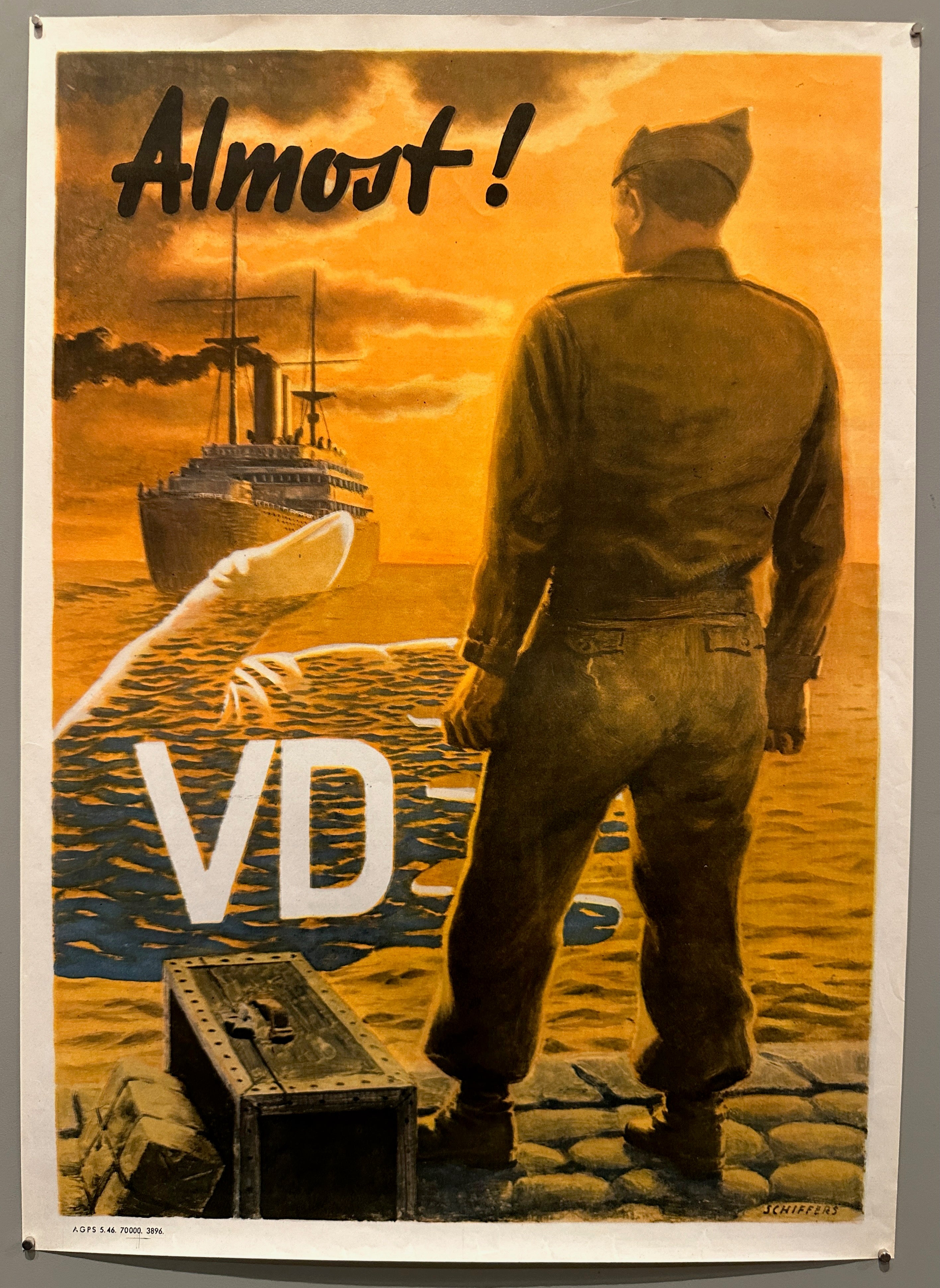Original vintage propaganda poster raising awareness of venereal disease and reproductive health for allied soldiers stationed in Europe after the World War.
