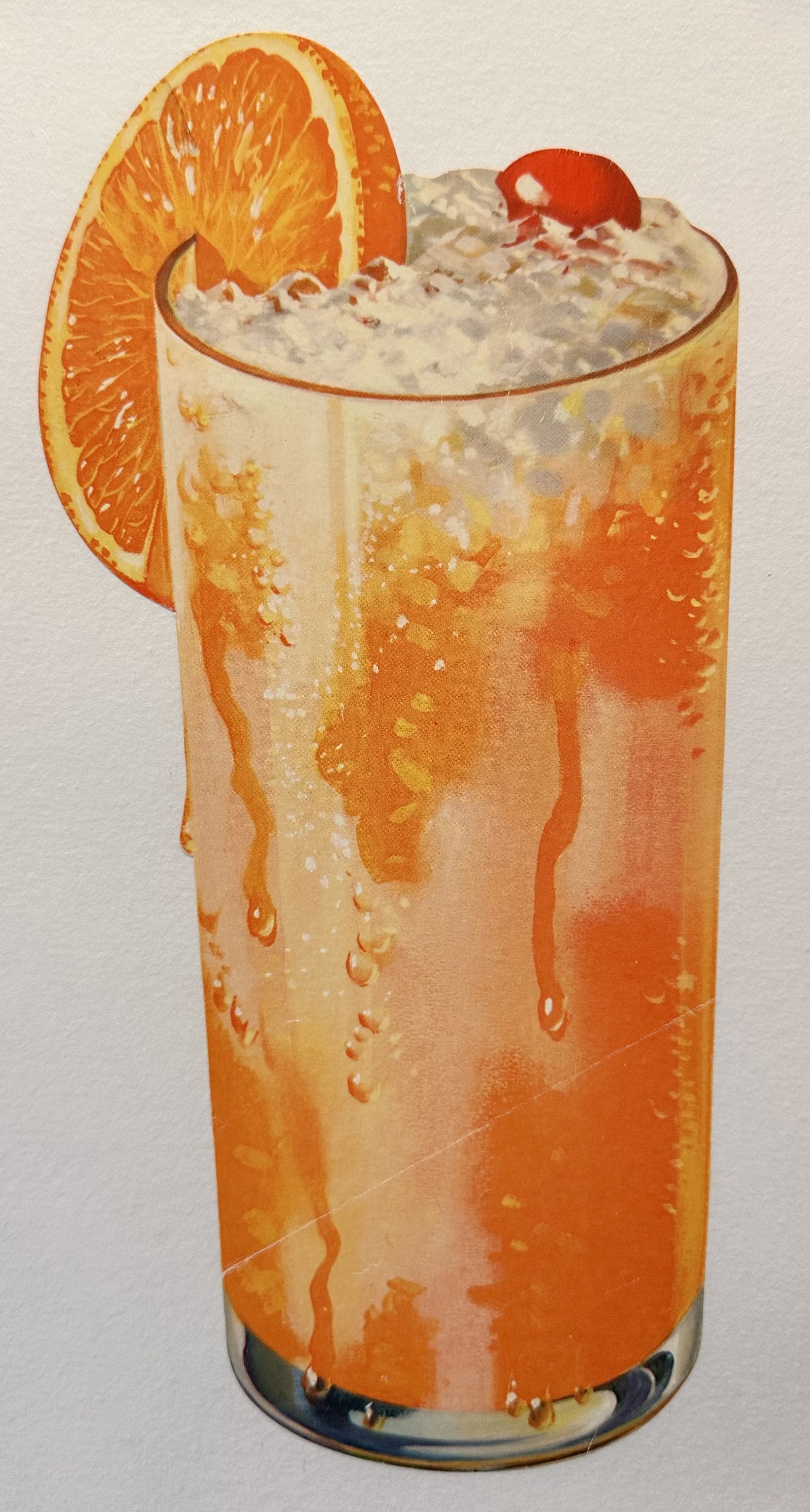 A tall glass filled with a bright orange-colored beverage, topped with a generous amount of frost