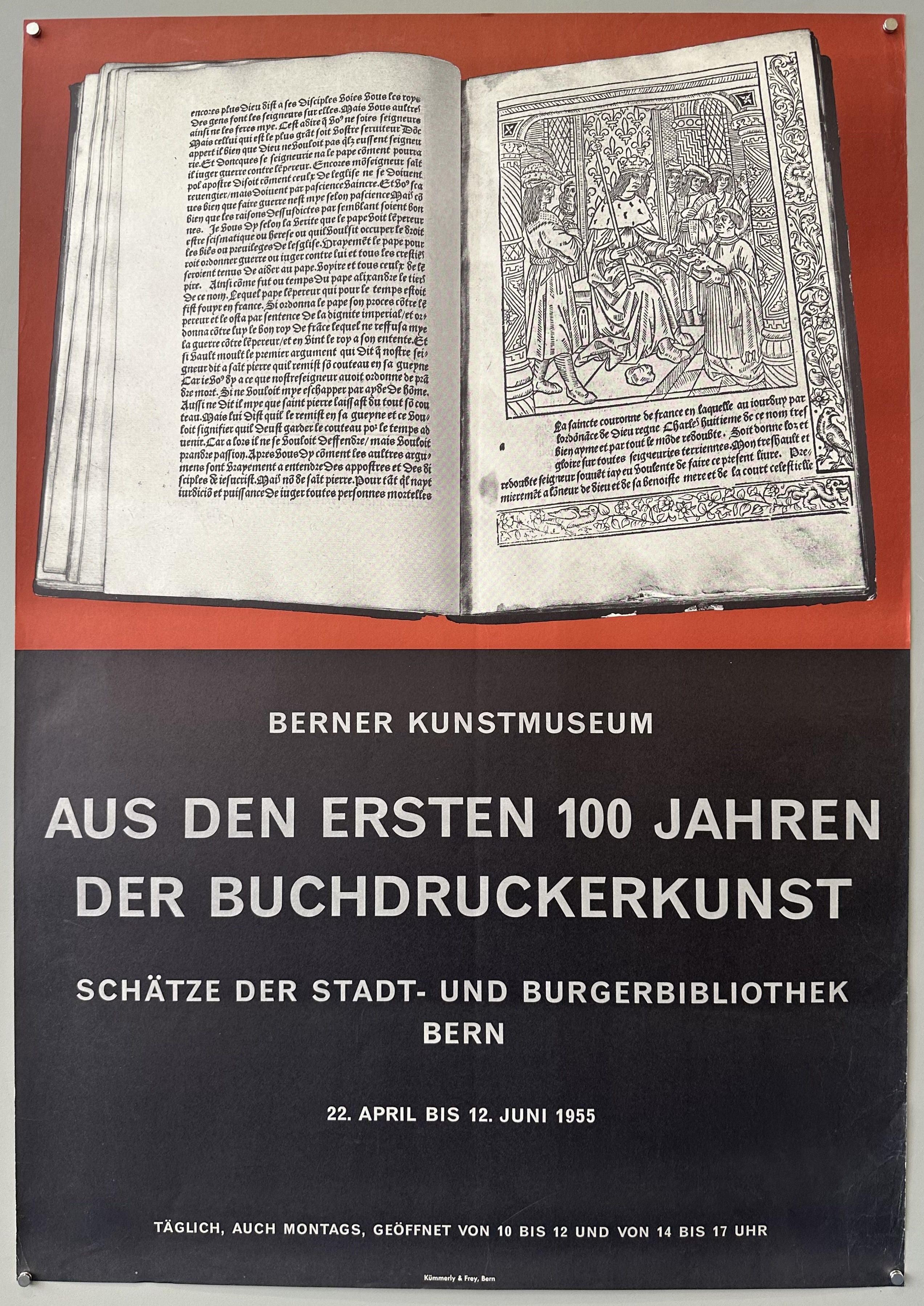 English translation: "Bern Art Museum / From the First 100 Years of the Art of Printing / Treasures of the City and Citizens' Library of Bern / April 22 to June 12, 1955"