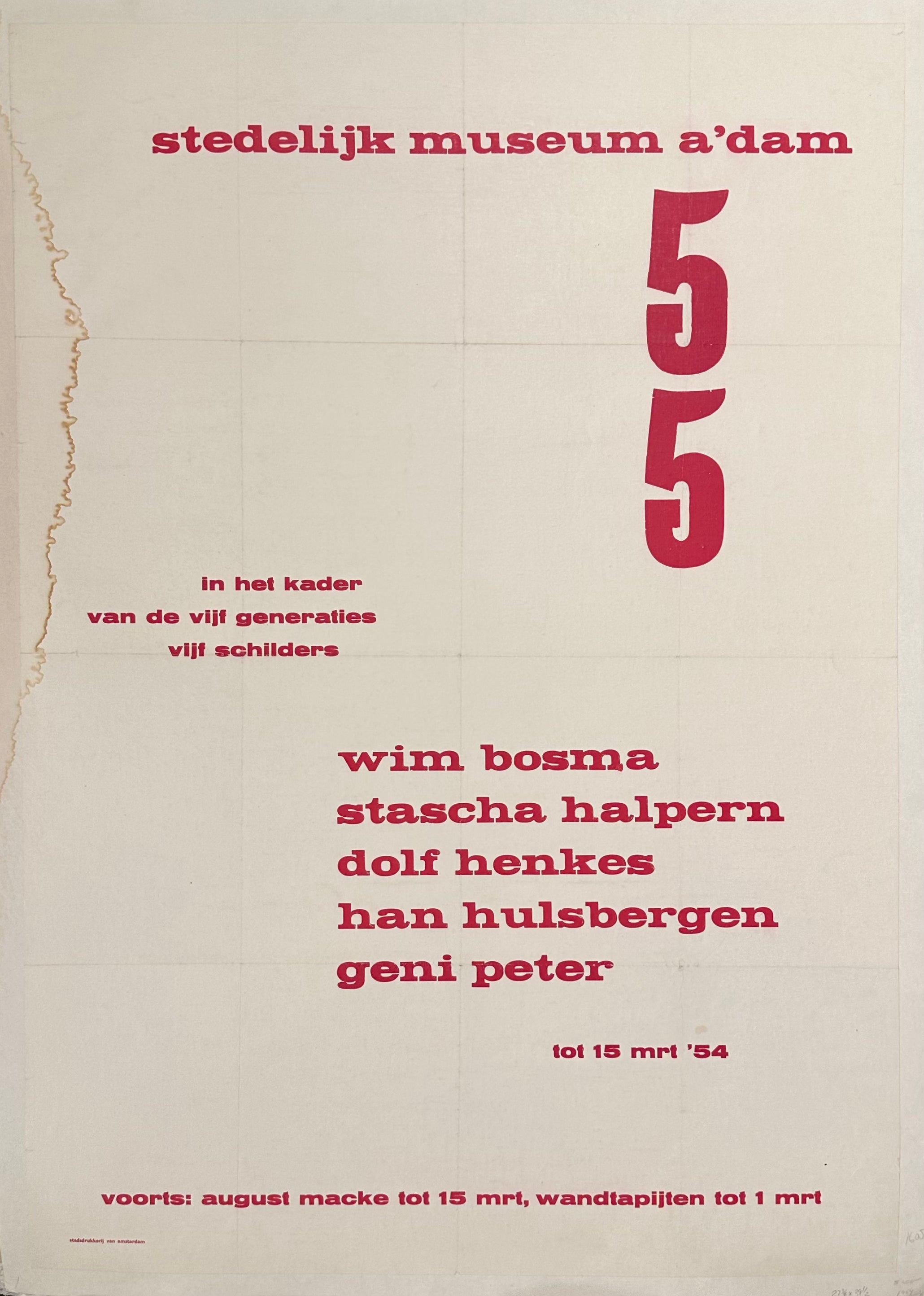 English translation: "Municipal Museum Amsterdam 55, in the context of the five generations of five painters: Wim Bosma, Stascha Halpern, Dolf Henkes, Han Hulsbergen, Geni Peter."