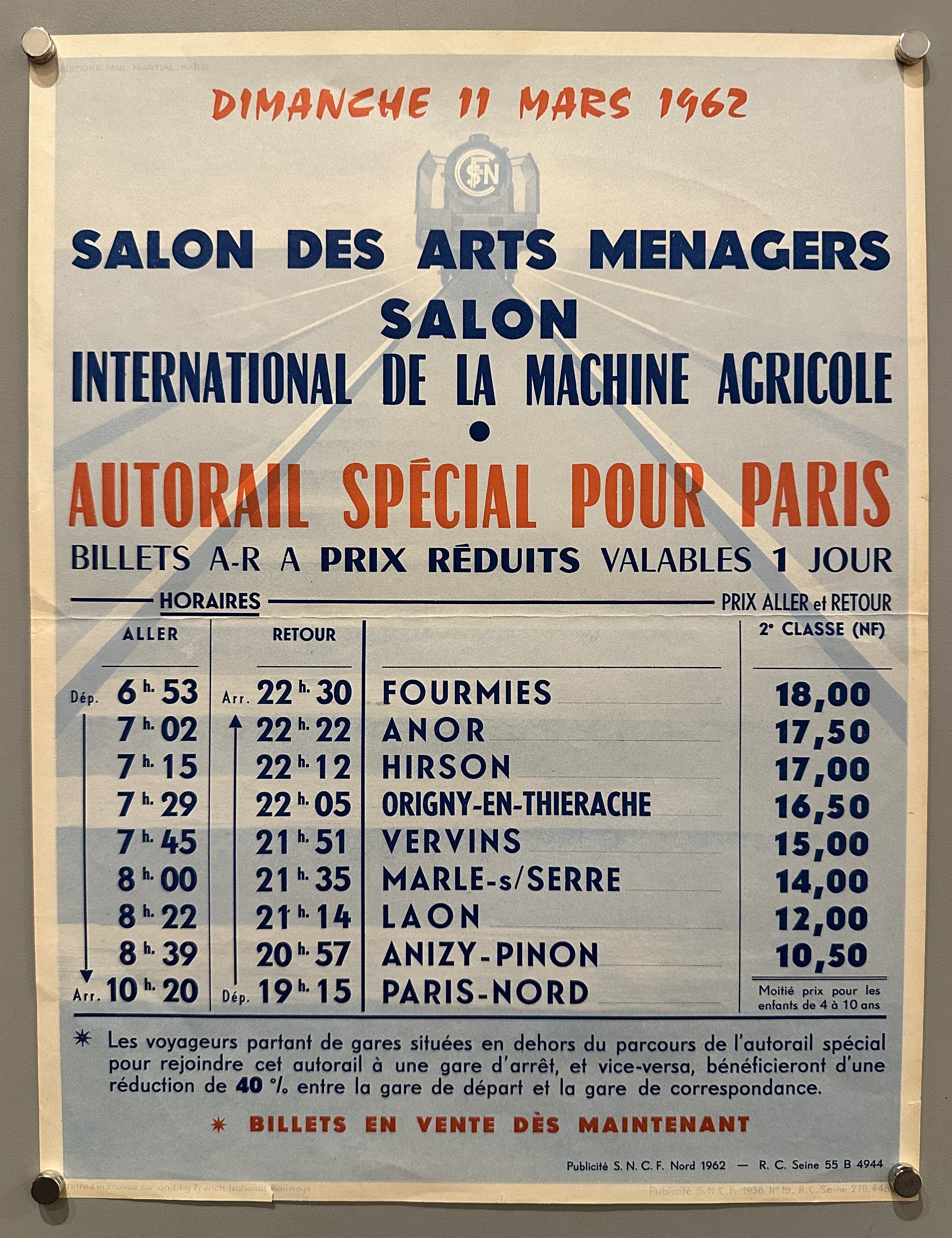 "Salon des arts ménagers salon / International de la Machine agricole / autorail spécial pour Paris / billets A-R à prix réduits valables 1 jour "