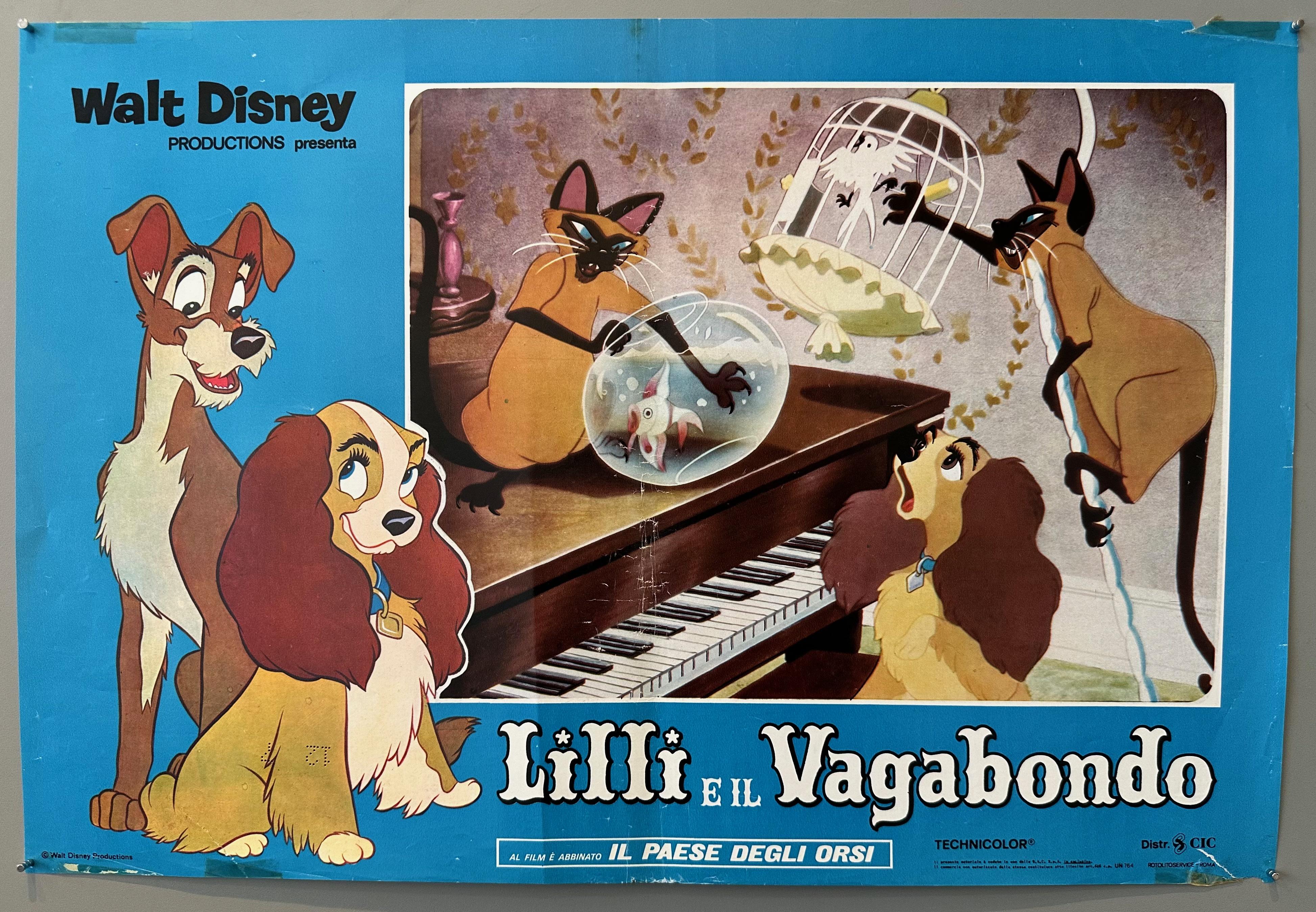 An Italian fim poster for Disney's 'Lady and the Tramp'. Each poster in this series features a different scene from the iconic movie.