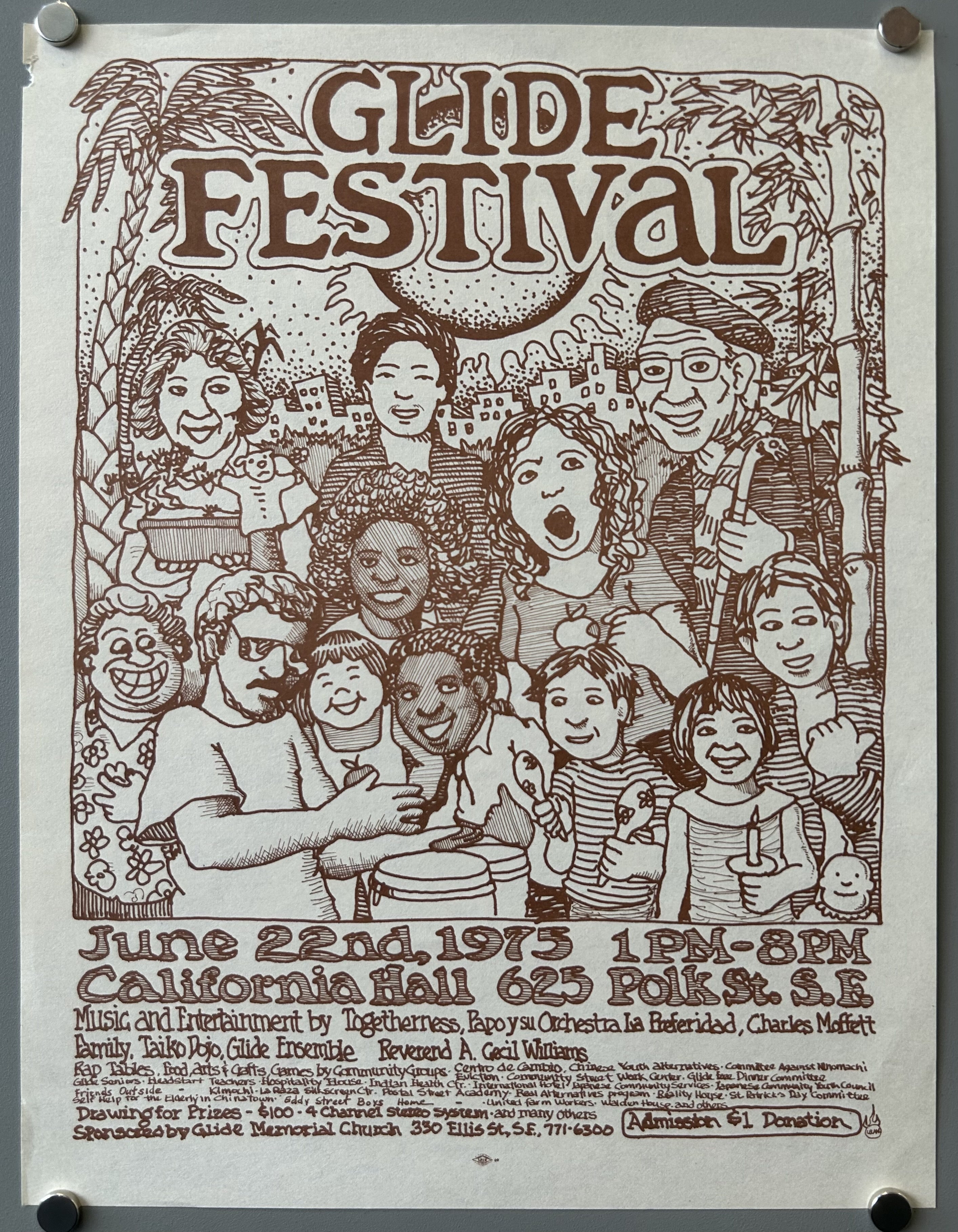 "Music and Entertainment by Togetherness, Papo y su Orchestra La Preferida, Charles Moffett Family, Taiko Dojo, Glide Ensemble, Reverend A. Williams."