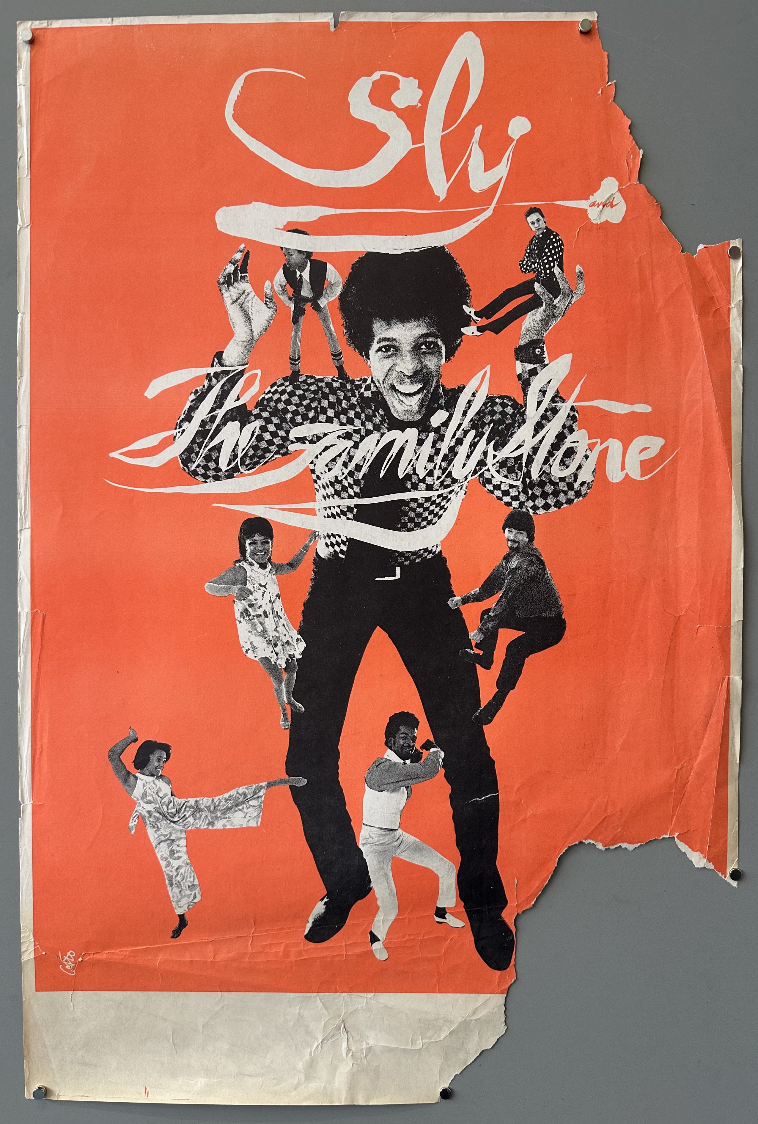 Rare original poster for an American band formed in San Francisco, California, in 1966 and active until 1983. Their work, which blended elements of funk, soul, psychedelic rock, gospel, and R&B, became a pivotal influence on subsequent American popular music.