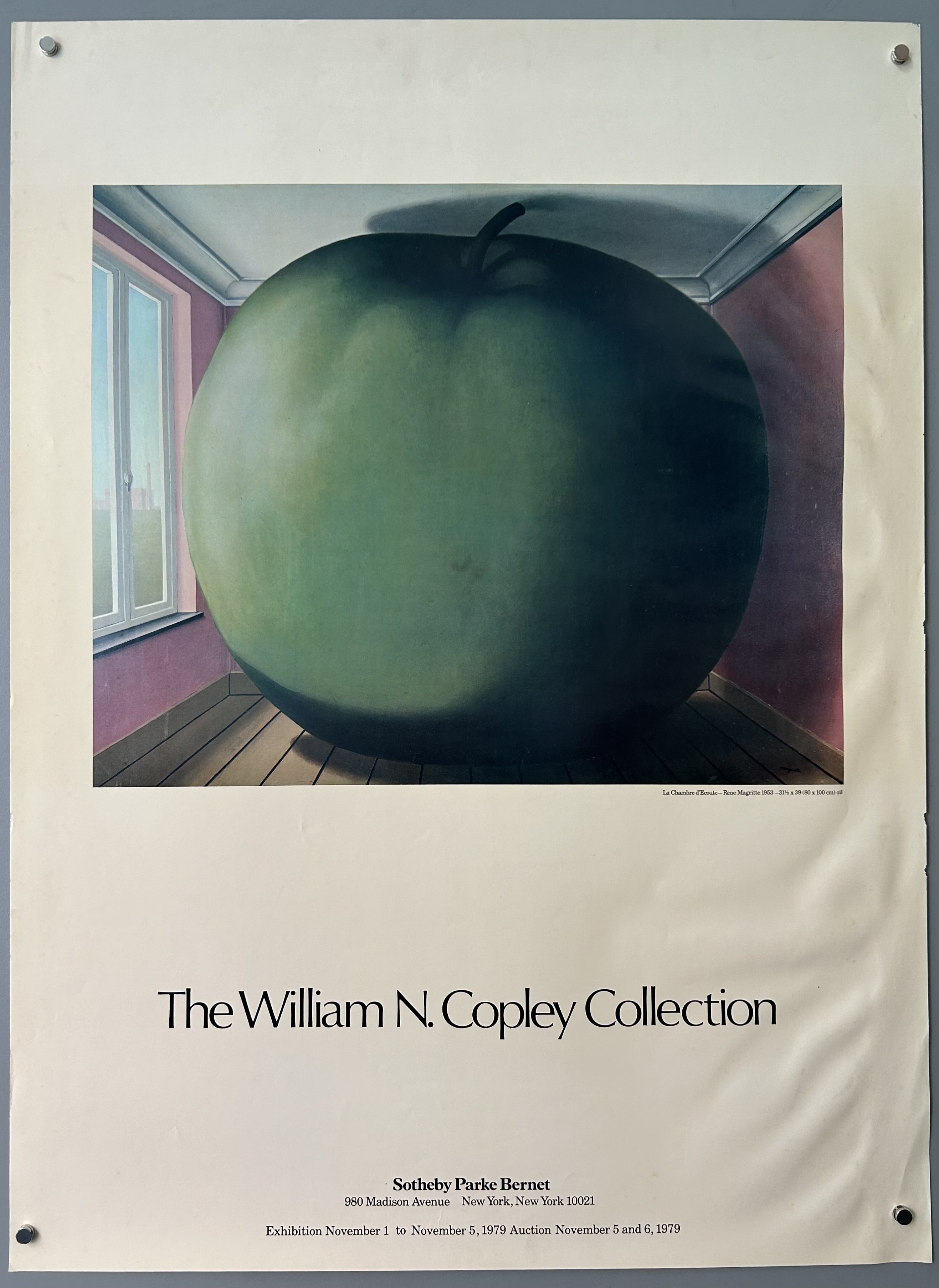 Art auction and exhibition poster. Painting in center is Rene Magritte's 'Le Chambre d'Ecoute' (1953).