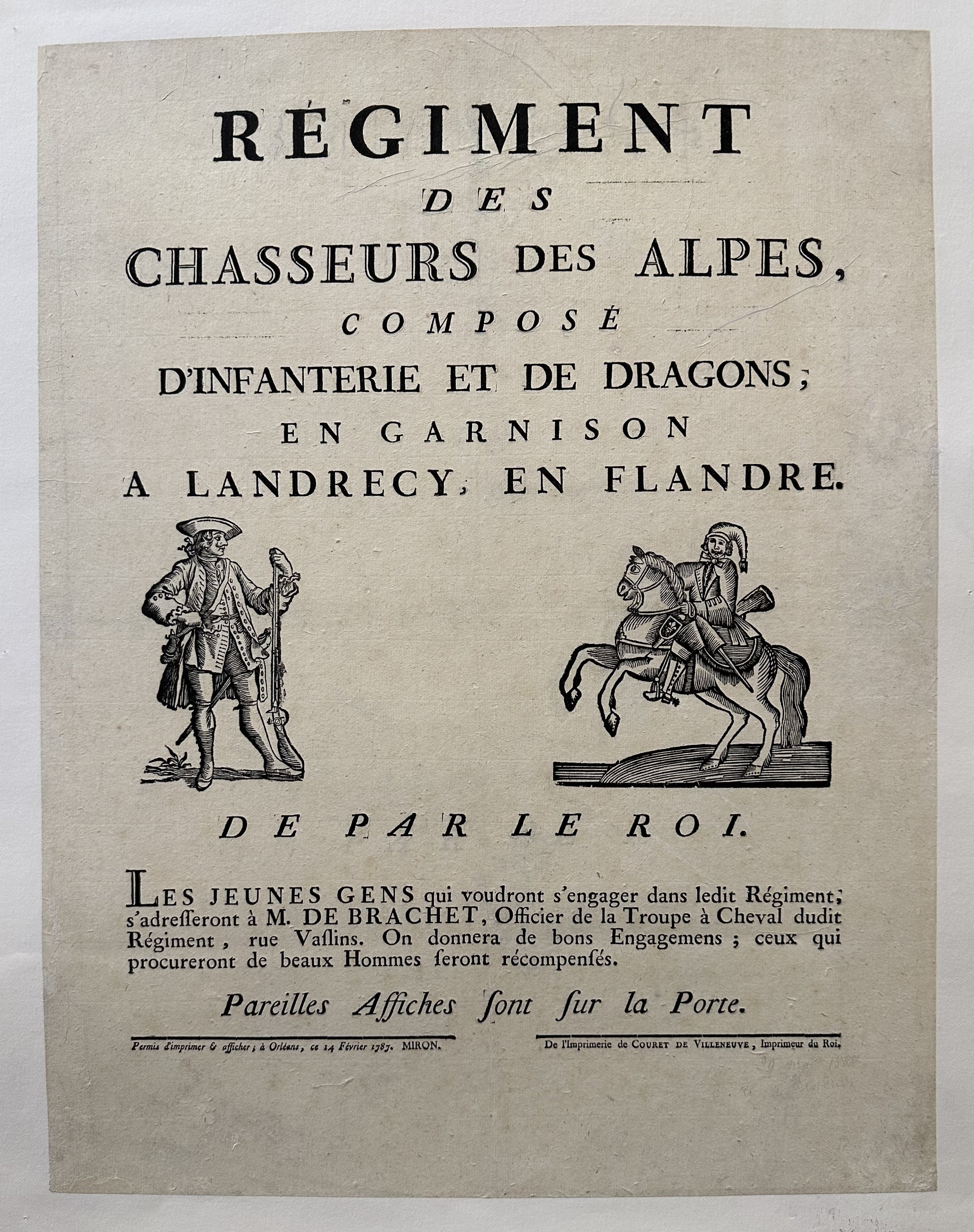 Translation: "YOUNG PEOPLE who wish to enlist in the said Regiment; should contact Mr. DE BRACHET, Officer of the Horse Troop of the said Regiment, rue Vaflins. Good Enlistments will be given; those who provide good Men will be rewarded."