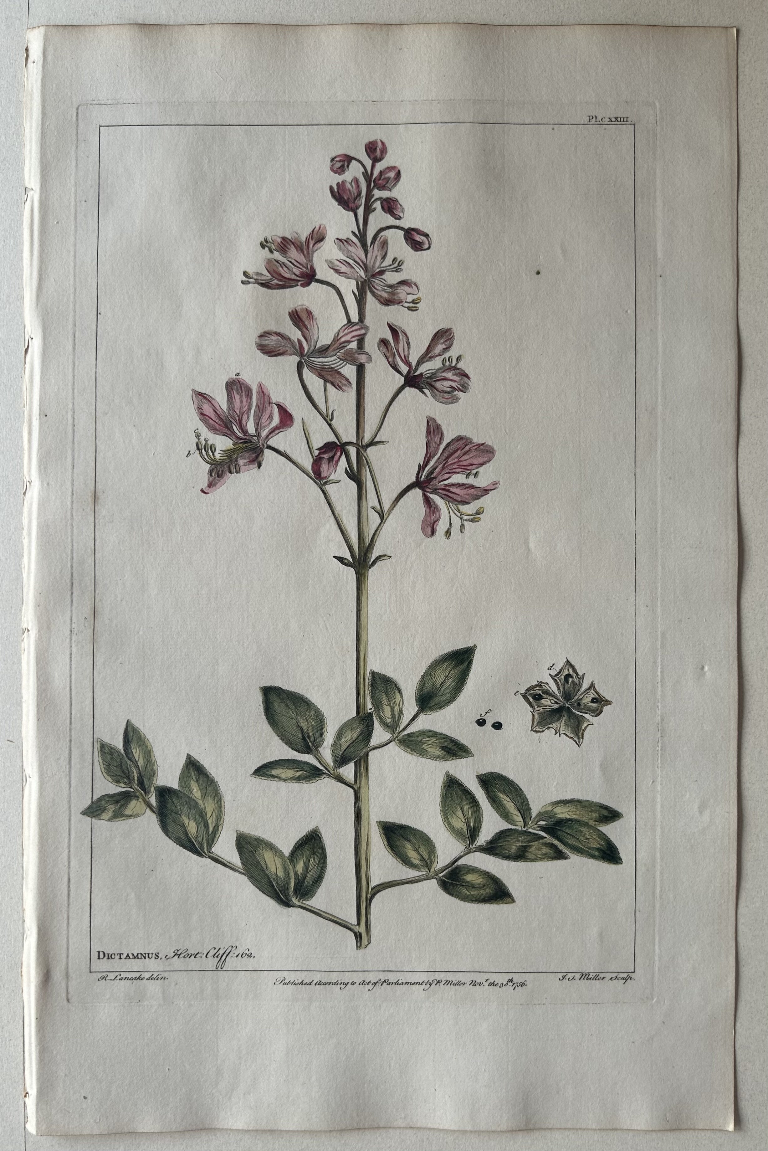 This hand-colored copper plate engraving is part of a collection of prints from the book Figures of the Most Beautiful Plants Described in the Gardeners Dictionary, published by Philip Miller in London in 1770. There were multiple contributing illustrators, including Georg Ehret.