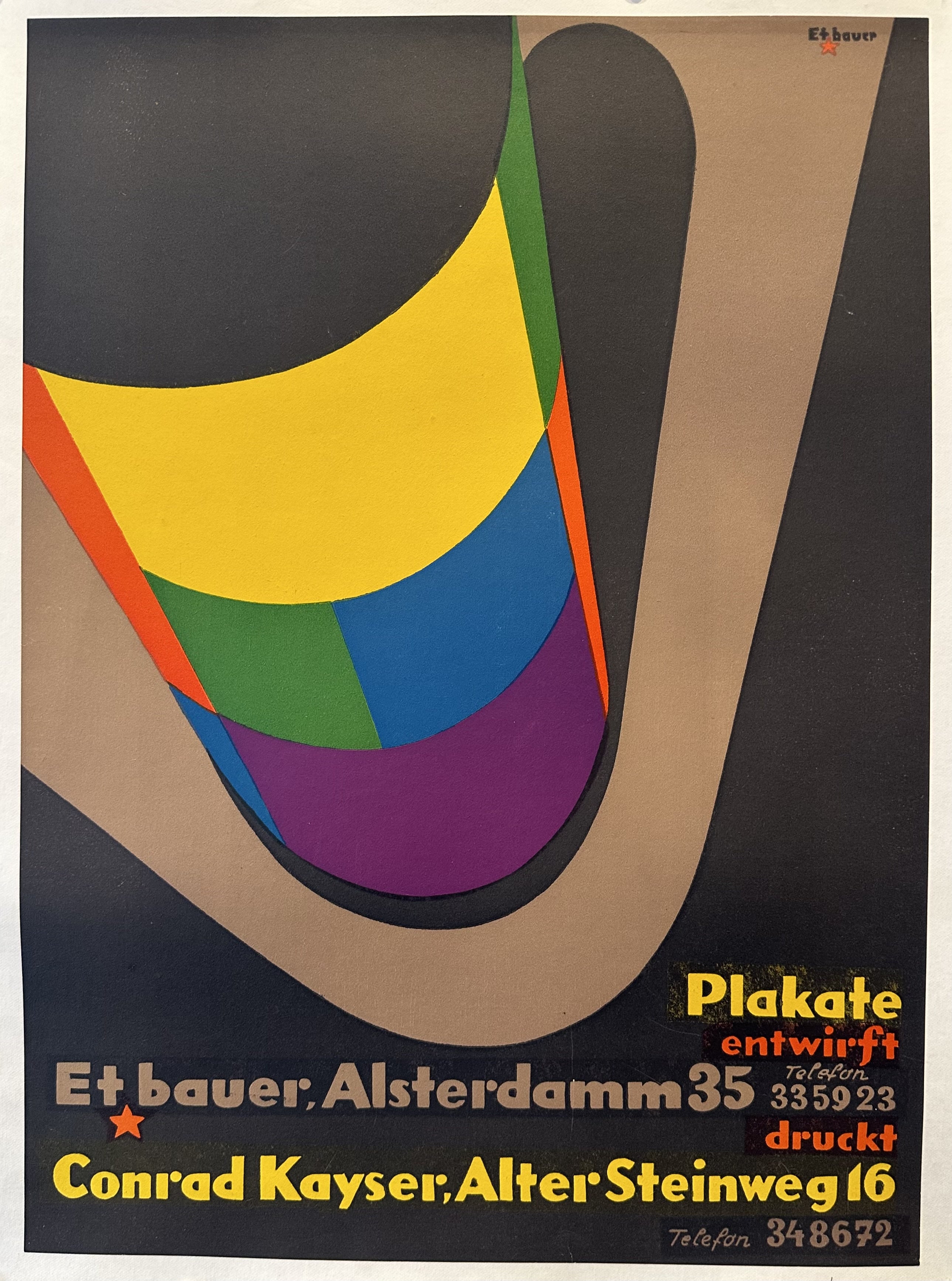 English translation: "Posters designed by Et Bauer, Alsterdamm 35 Telephone 335923, printed by Conrad Kayser, Alter Steinweg 16 Telephone 348672"
