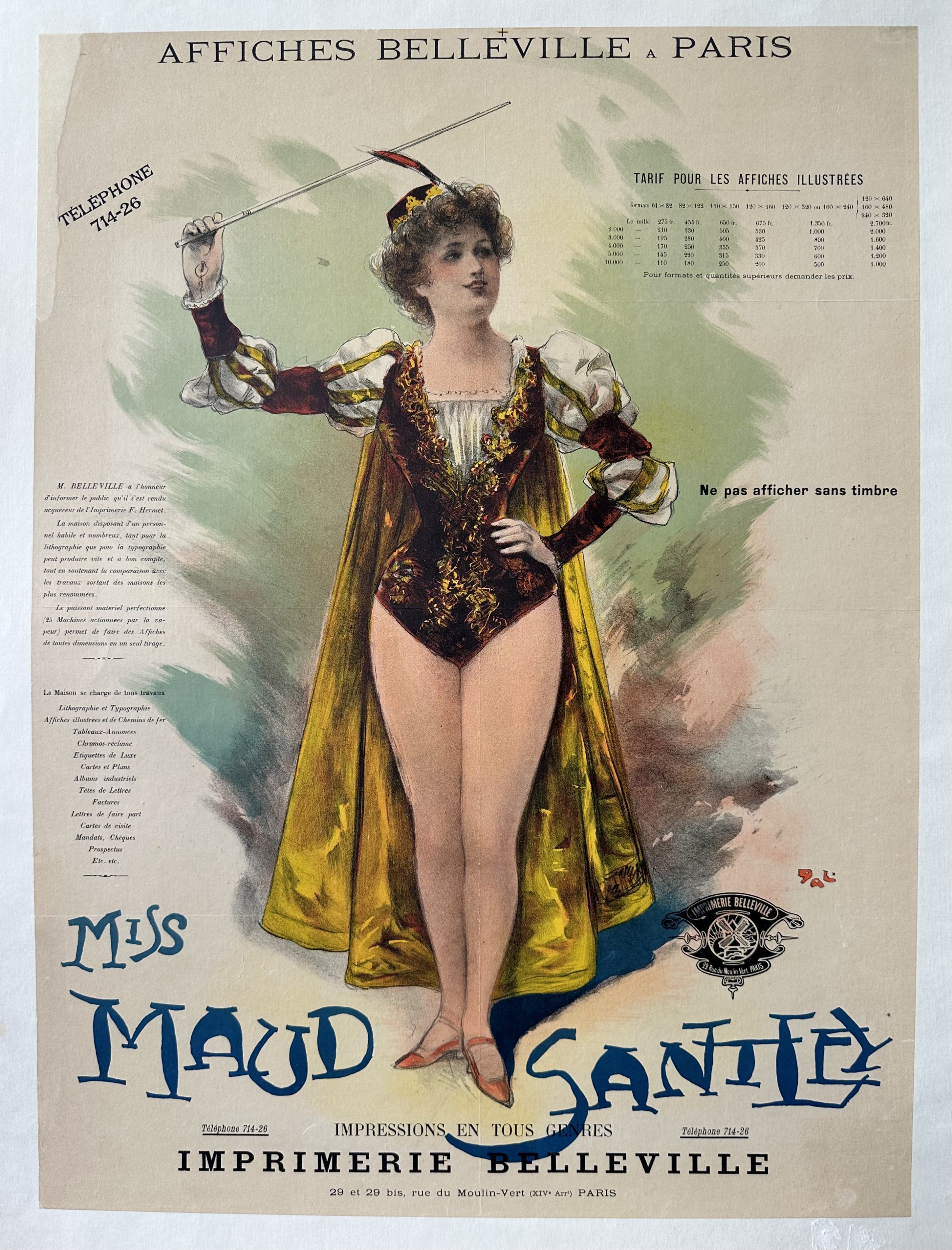 English translation: "Mr. BELLE VILLE has the honor of informing the public that he has acquired the F. Hermet Printing House. The company, having a skilled and numerous staff, both for lithography and for typography, can produce quickly and cheaply, while supporting the comparison with the work coming out of the most renowned companies. / The powerful equipment improved (25 steam-powered machines) allows to make Posters of all sizes in a single print run. / The Company takes care of all Lithography and Typography work, Illustrated and Railway Posters, Advertisement Boards, Advertising Chromos, Luxury Labels, Maps and Plans, Industrial Albums, Election Cards, Invoices, Announcement Letters, Business Cards, Money Orders, Checks, Prospectuses, etc.".