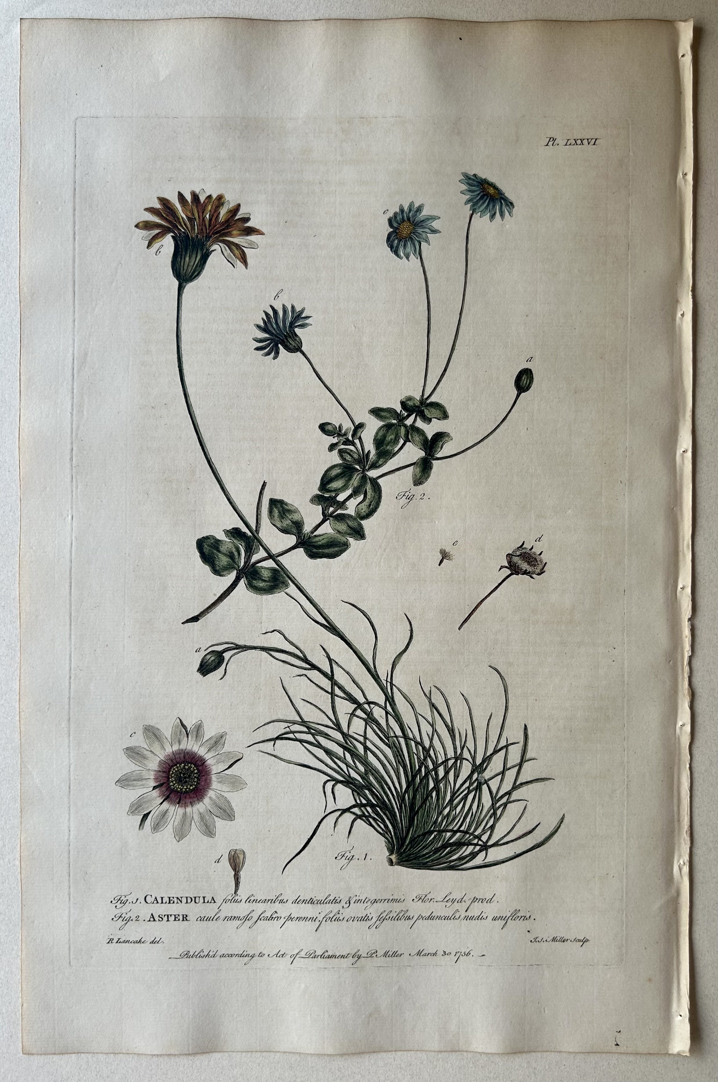 This print depicts a type of calendula —a type of marigold — and a type of aster.