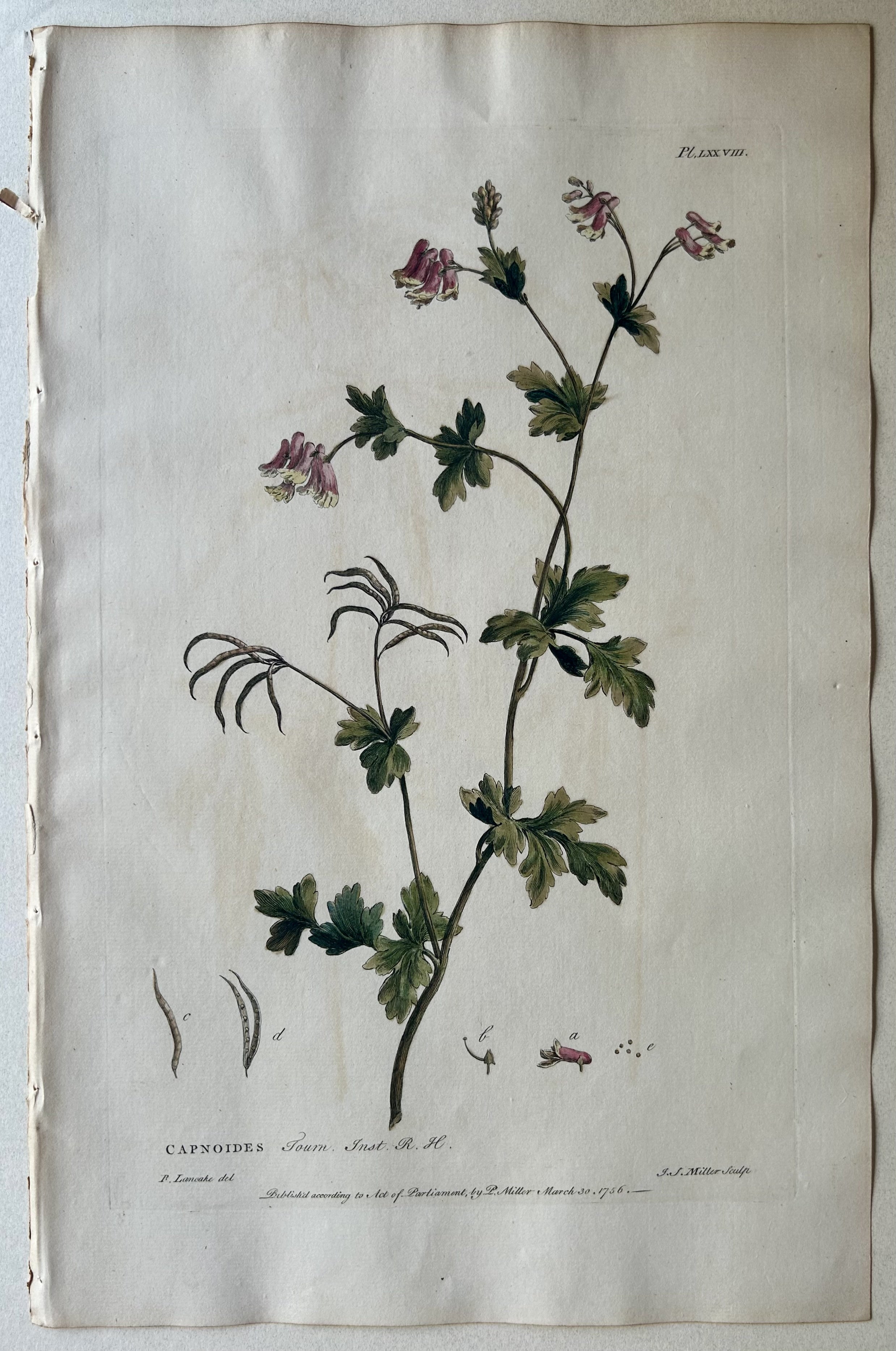 This hand-colored copper plate engraving is part of a collection of prints from the book Figures of the Most Beautiful Plants Described in the Gardeners Dictionary, published by Philip Miller in London in 1770. There were multiple contributing illustrators, including Georg Ehret.