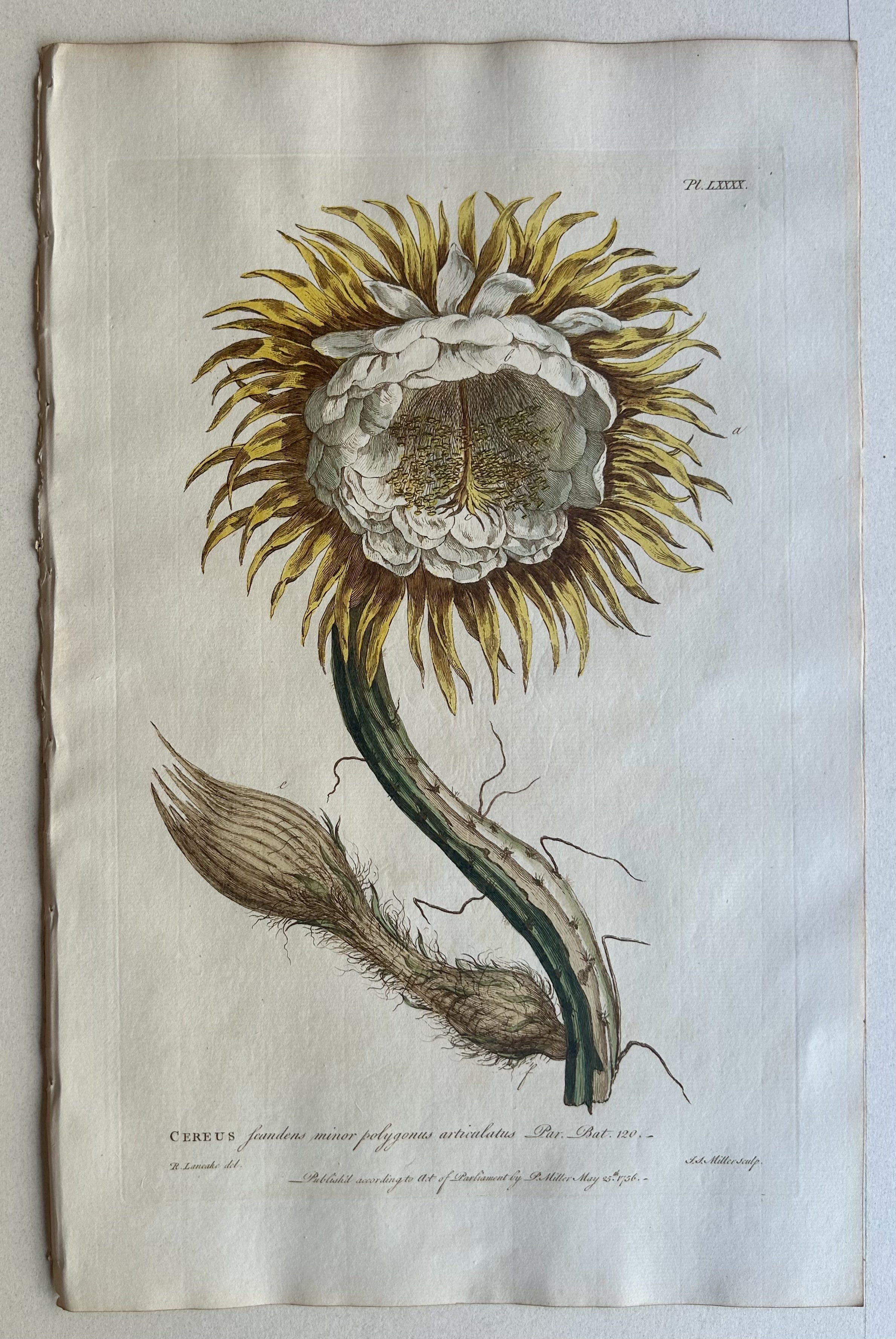 This hand-colored copper plate engraving is part of a collection of prints from the book Figures of the Most Beautiful Plants Described in the Gardeners Dictionary, published by Philip Miller in London in 1770. There were multiple contributing illustrators, including Georg Ehret.