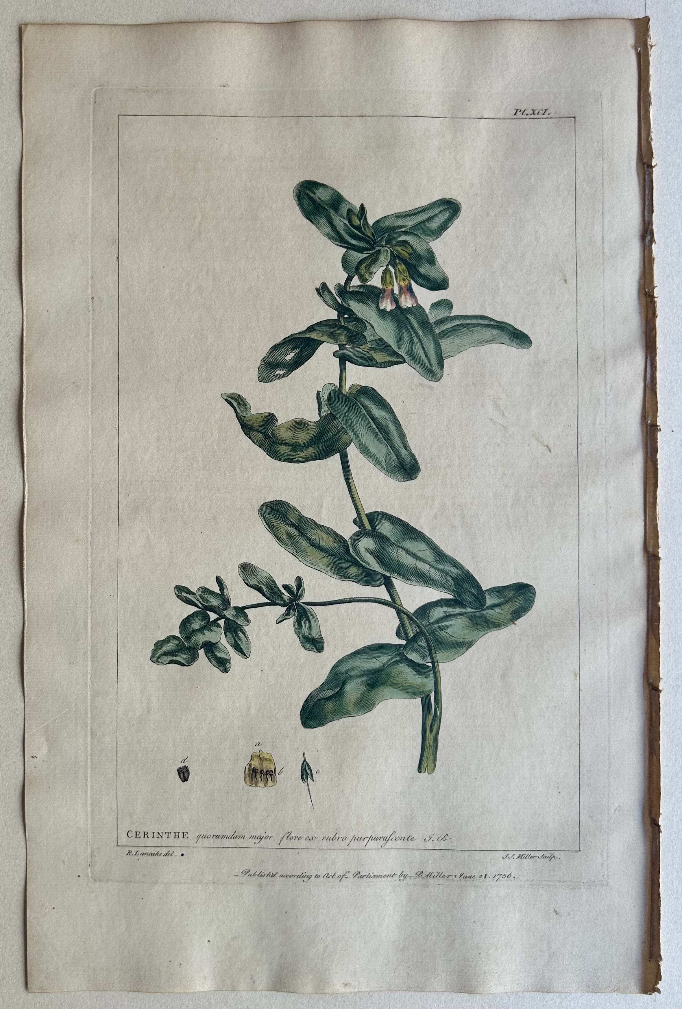 This hand-colored copper plate engraving is part of a collection of prints from the book Figures of the Most Beautiful Plants Described in the Gardeners Dictionary, published by Philip Miller in London in 1770. There were multiple contributing illustrators, including Georg Ehret.