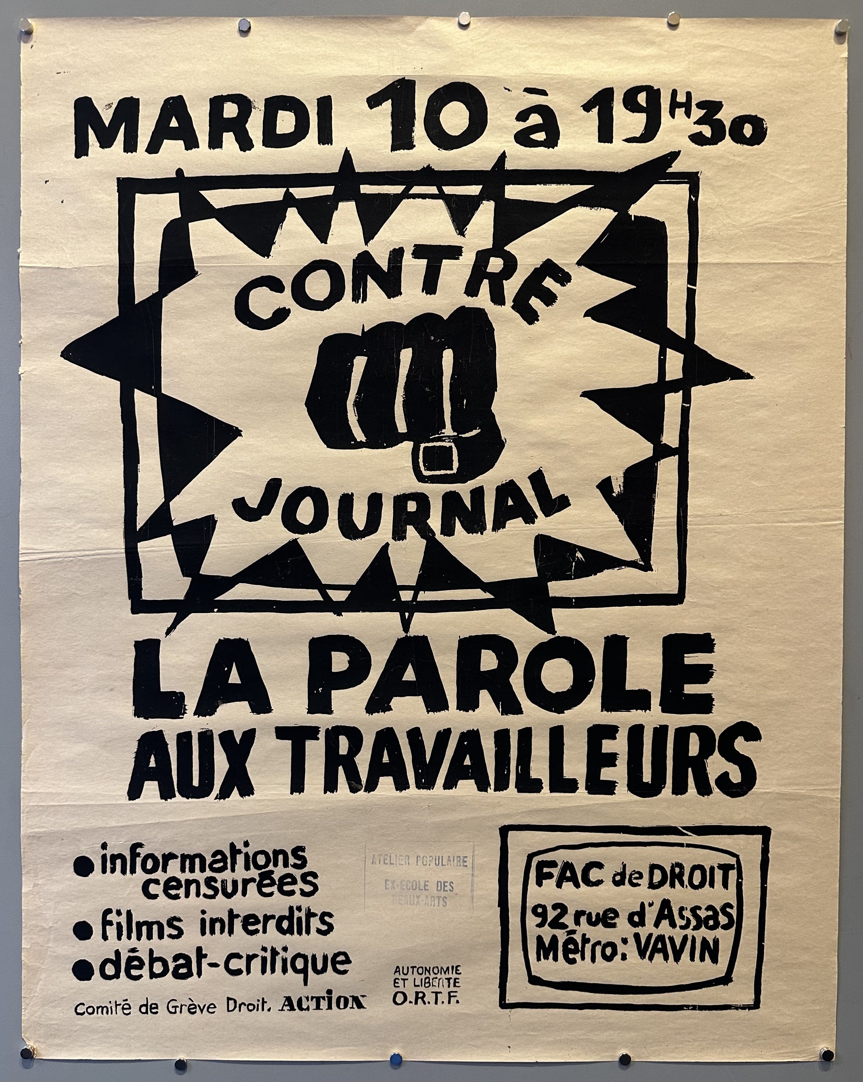 English translation: "Tuesday 10 at 7:30 p.m. / Contre Journal / La Parole Aux Travailleurs / censored information, banned films, critical debate"