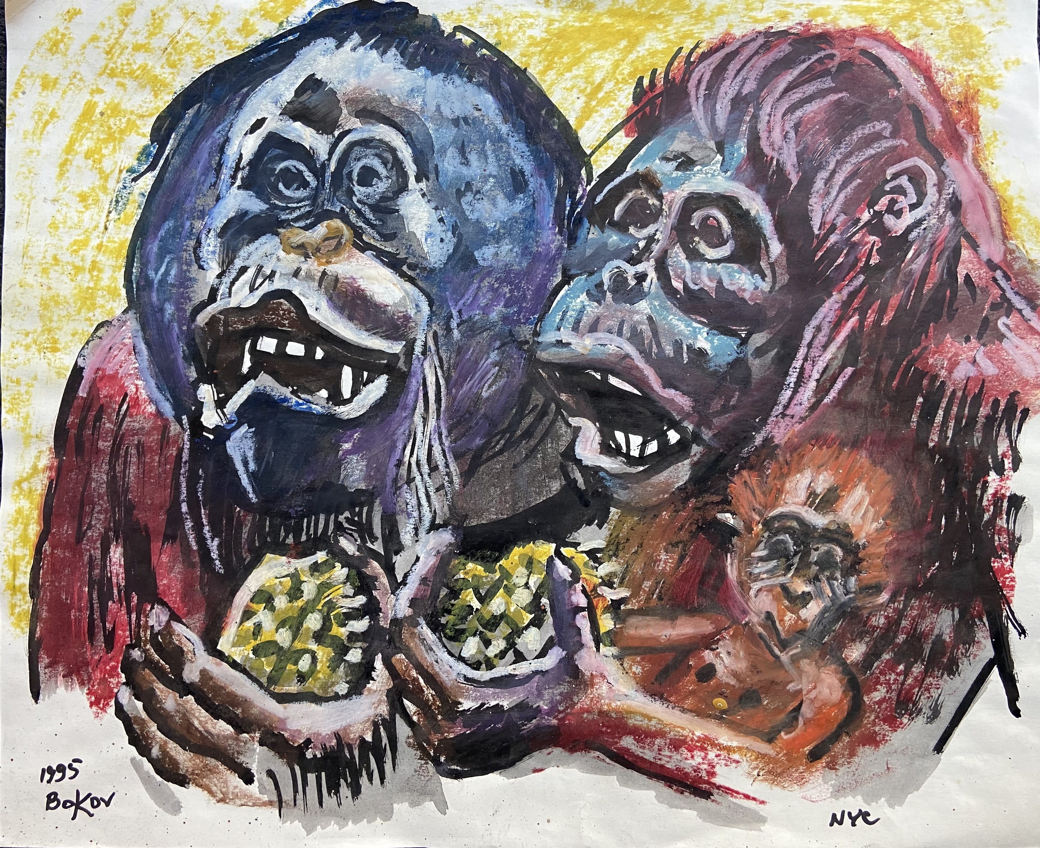 Bokov artwork showing two bigger gorillas, one of them cradling a baby gorilla, both holding yellowish fruits.