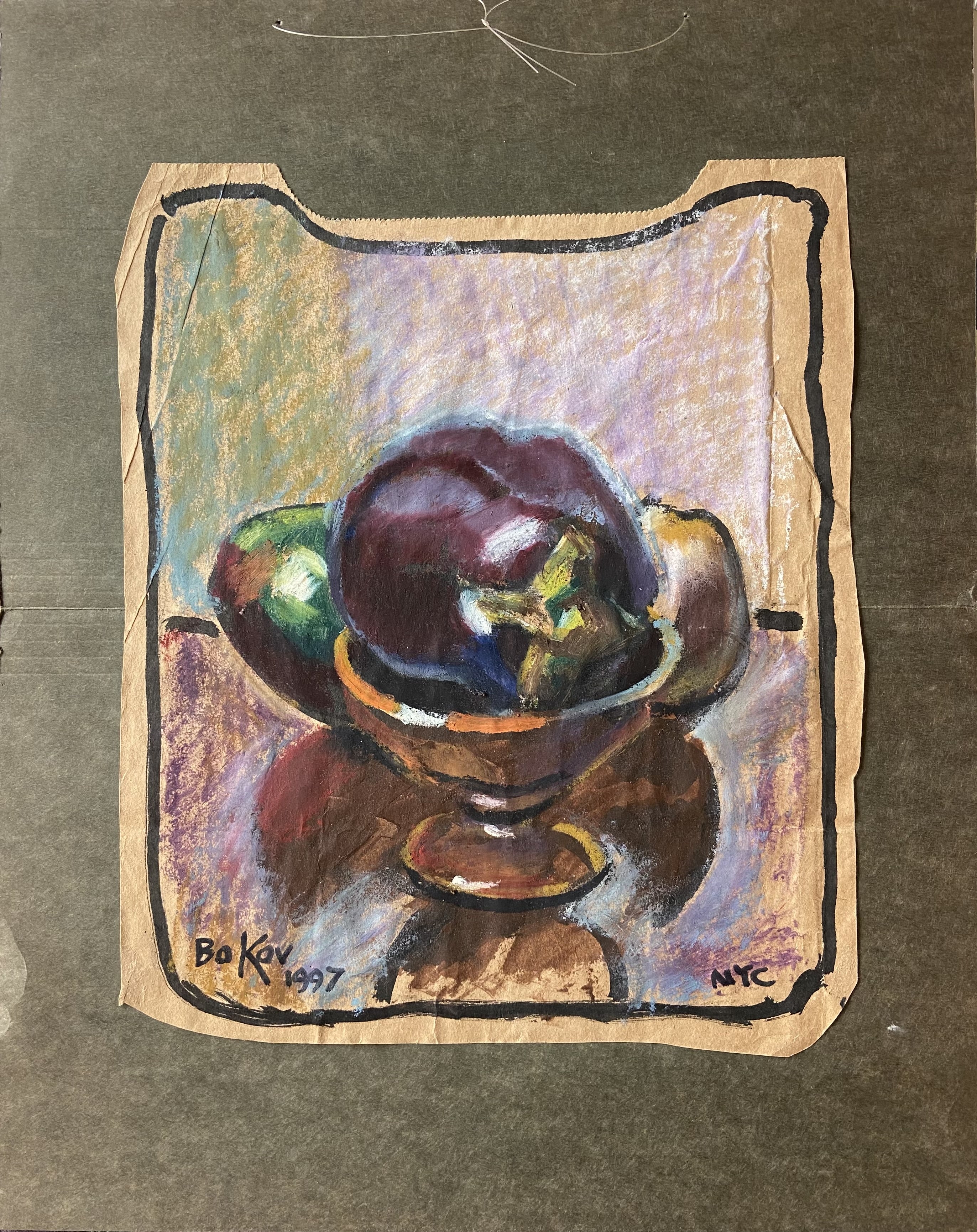 Bokov still life artwork showing fruit in a bowl and on the counter.