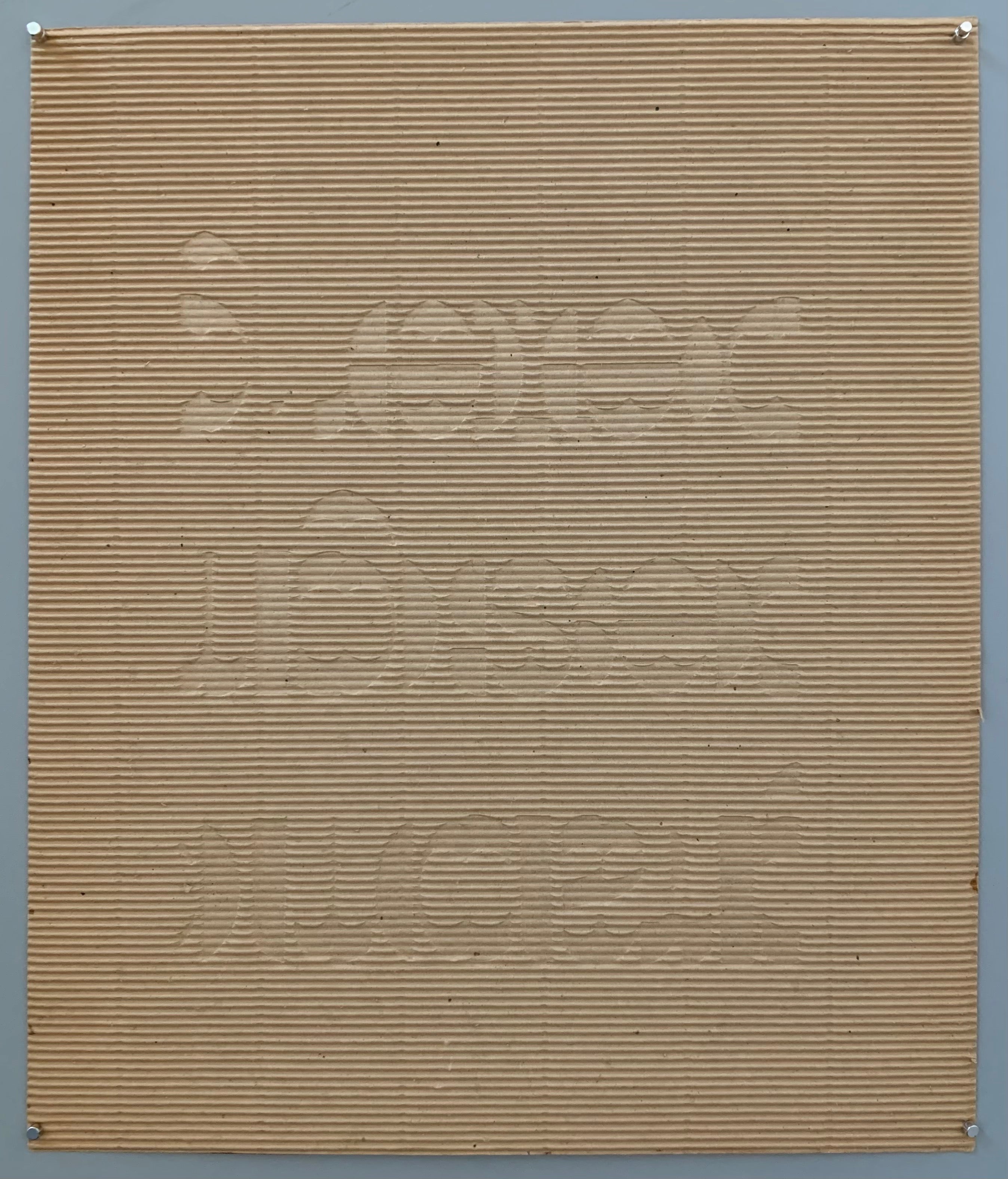 Description: Original etching on corrugated cardboard piece. This is an extremely unique piece from Gee, as it does not fall under his traditional pop art aesthetic. The color is the natural mute tan of the cardboard, making it stand out against Gee’s work during this era.