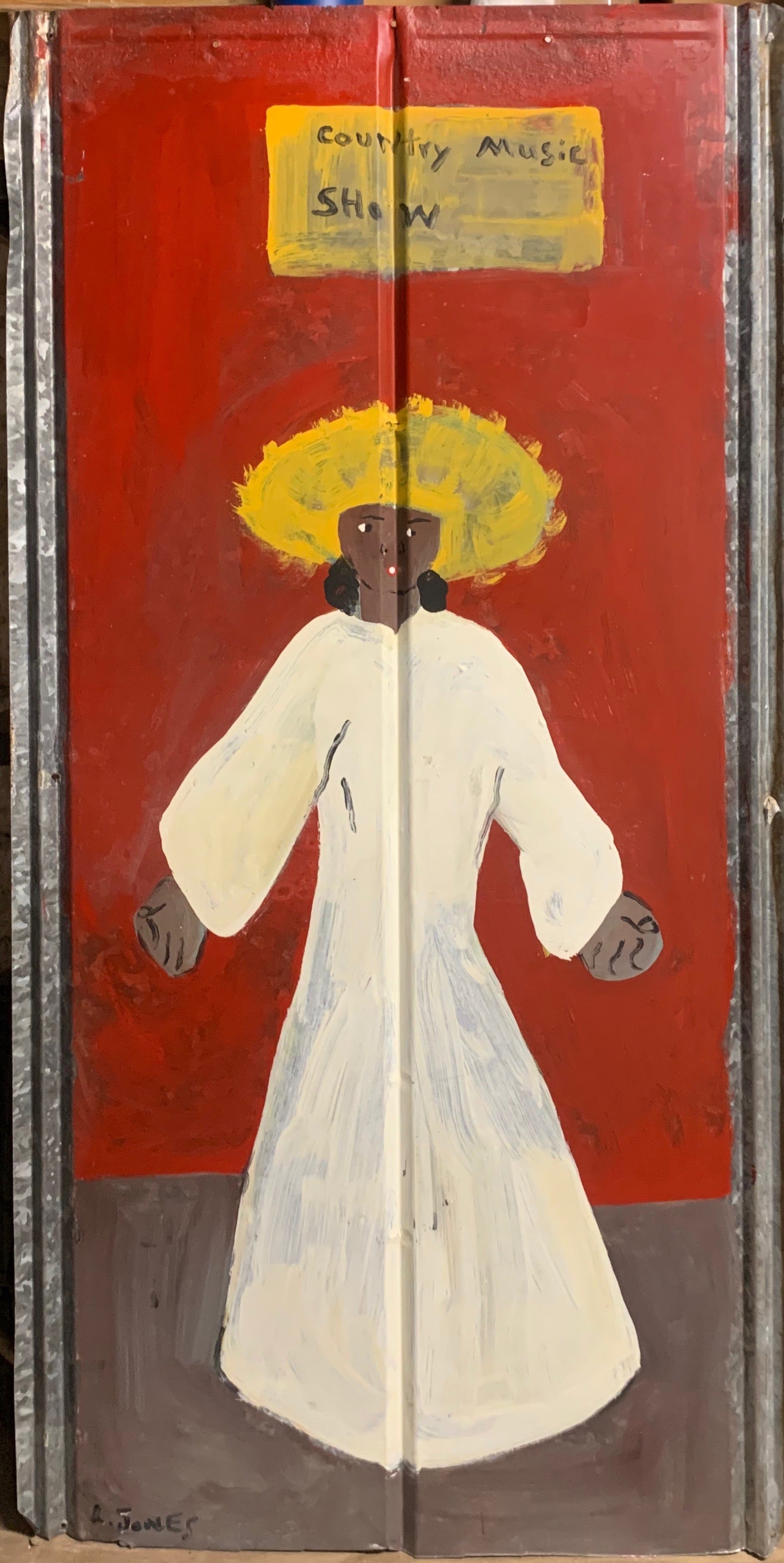 A native Georgian, Leonard Jones taught himself to paint when he was in high school. His works are greatly inspired by scenes from his childhood, images of rural living in the South including housewives, church-goers, and laborers. A folk artist who is often considered an outsider, Jones paints to capture candid daily life and the beauty found in the community around him.The use of scrap wood or tin roofing alludes to the buildings he grew up with, and he often incorporates these materials into the paintings themselves. The materials are covered in bold backgrounds of color, which Jones paints subjects over using his fingers or the handles of brushes, leaving a distinctly Leonard Jones work of art.