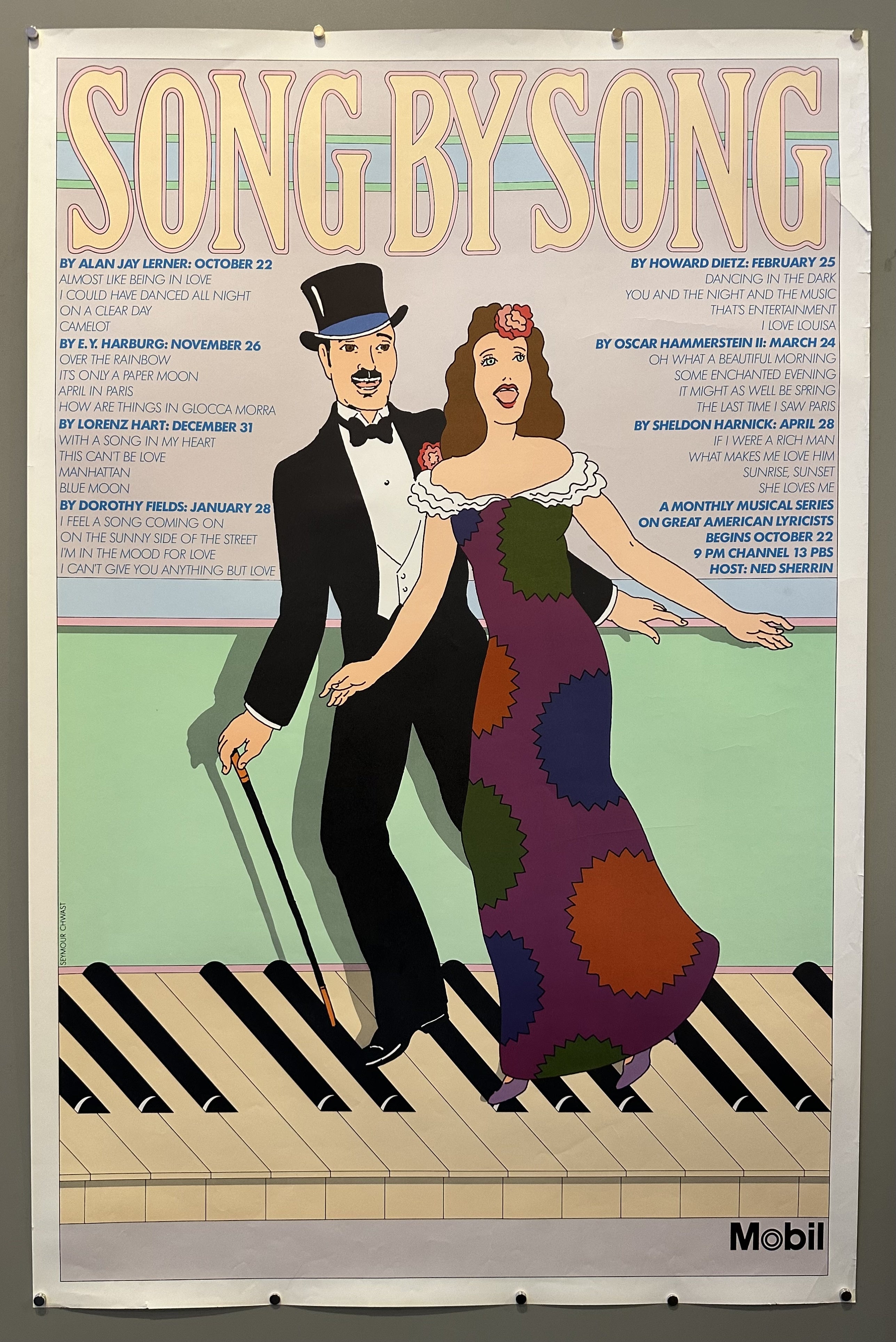 Vintage PBS advertisement poster for a broadcast of Broadway classics by the likes of Alan Jay Lerner, Oscar Hammerstein II, Dorothy Fields, E.Y. Harburg, and Sheldon Harnick.