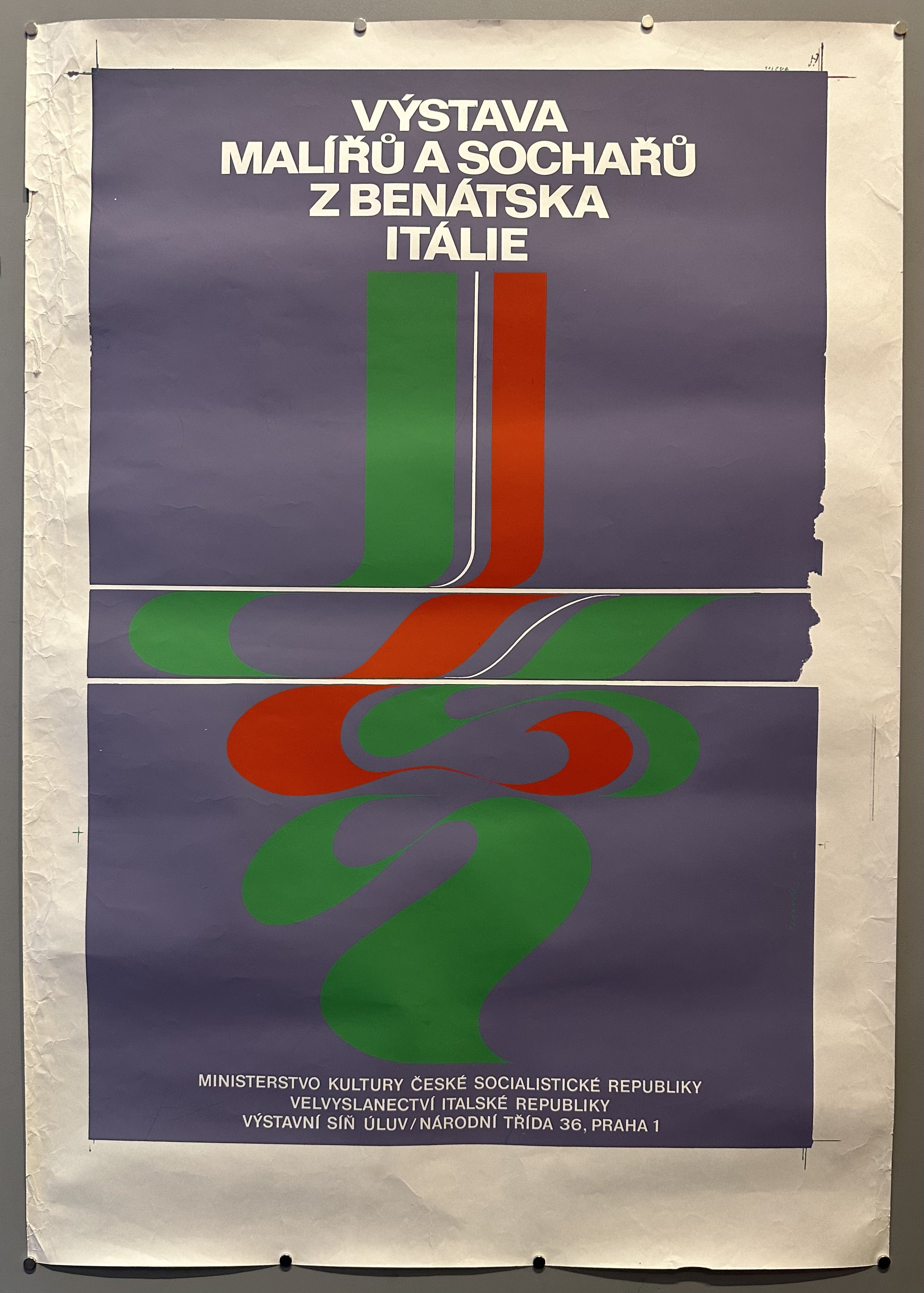 English translation: "Exhibition / Painters and Sculptors / From Veneto, Italy / Ministry of Culture of the Czech Socialist Republic / Embassy of the Italian Republic / Exhibition Hall Úluv/Národní Třída 36, Prague 1"