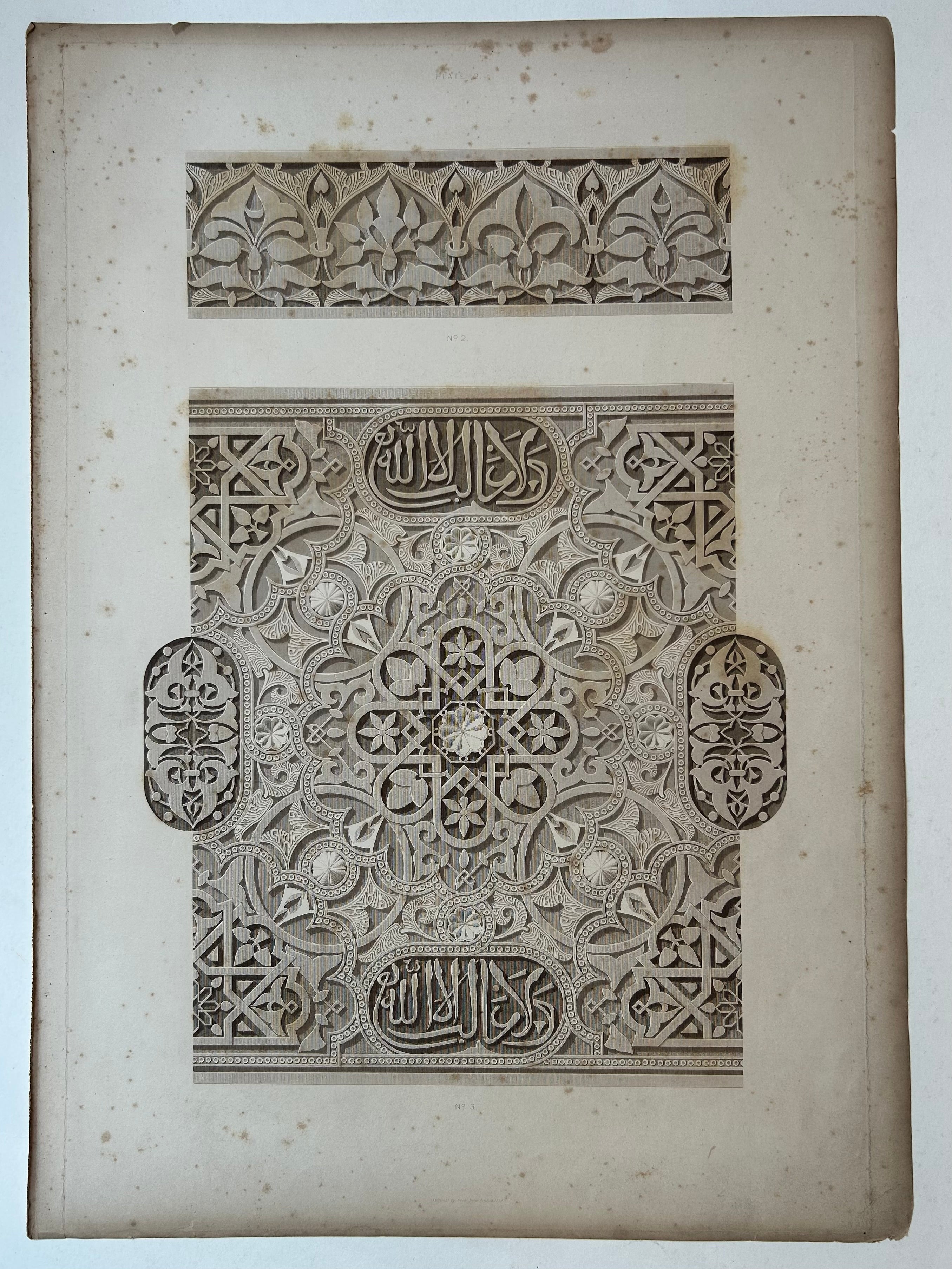 This print comes from a compilation of plans, elevations, sections and details or the famous Alhambra. The Alhambra is a feat of Islamic architecture, a palace in Grenada, Spain. This book was created from the drawings of architects Jules Goury and Owen Jones. Jones was known for his eye for design and is often attributed with being a pioneer of modern color theory. His attention to detail is recognized in his works in this compilation. The works of Goury included in this compilation were drawings done on site at the Alhambra in 1834.