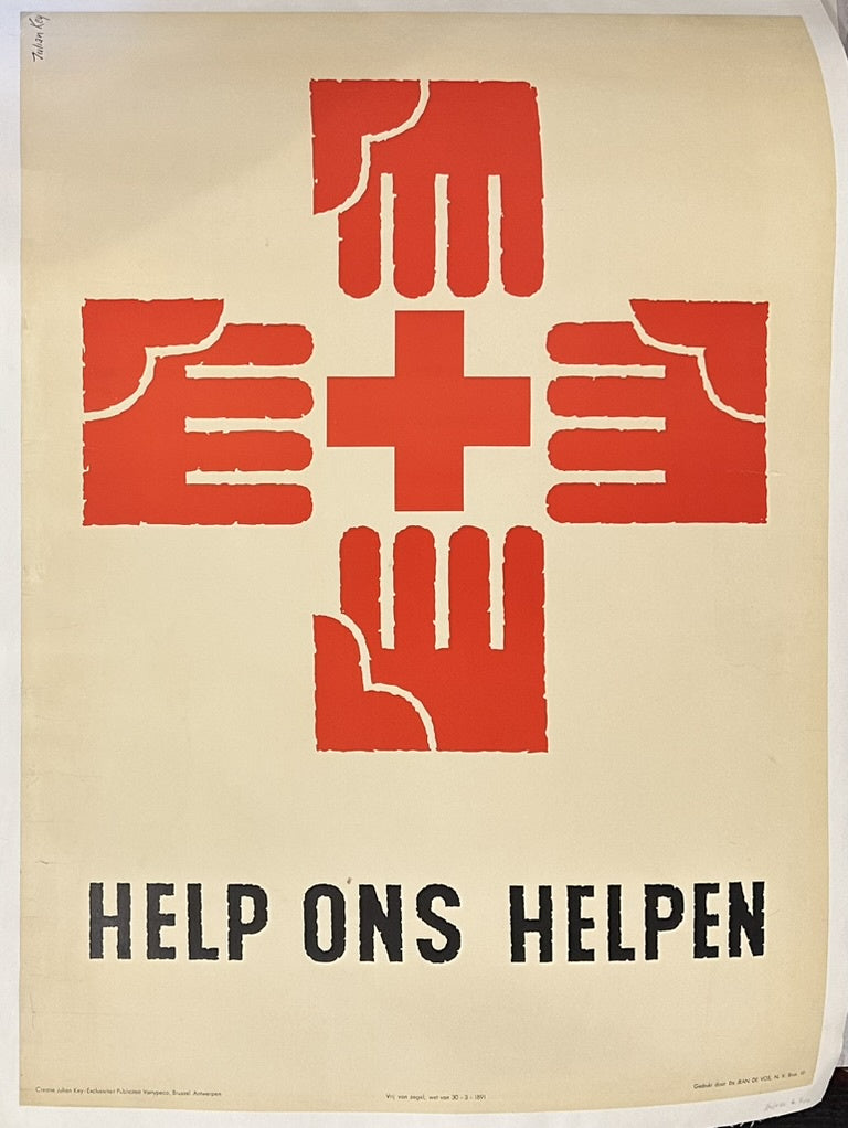 Red Cross symbol formed by four hands reaching towards a central cross, with the text "HELP ONS HELPEN" (Help Us Help) below
