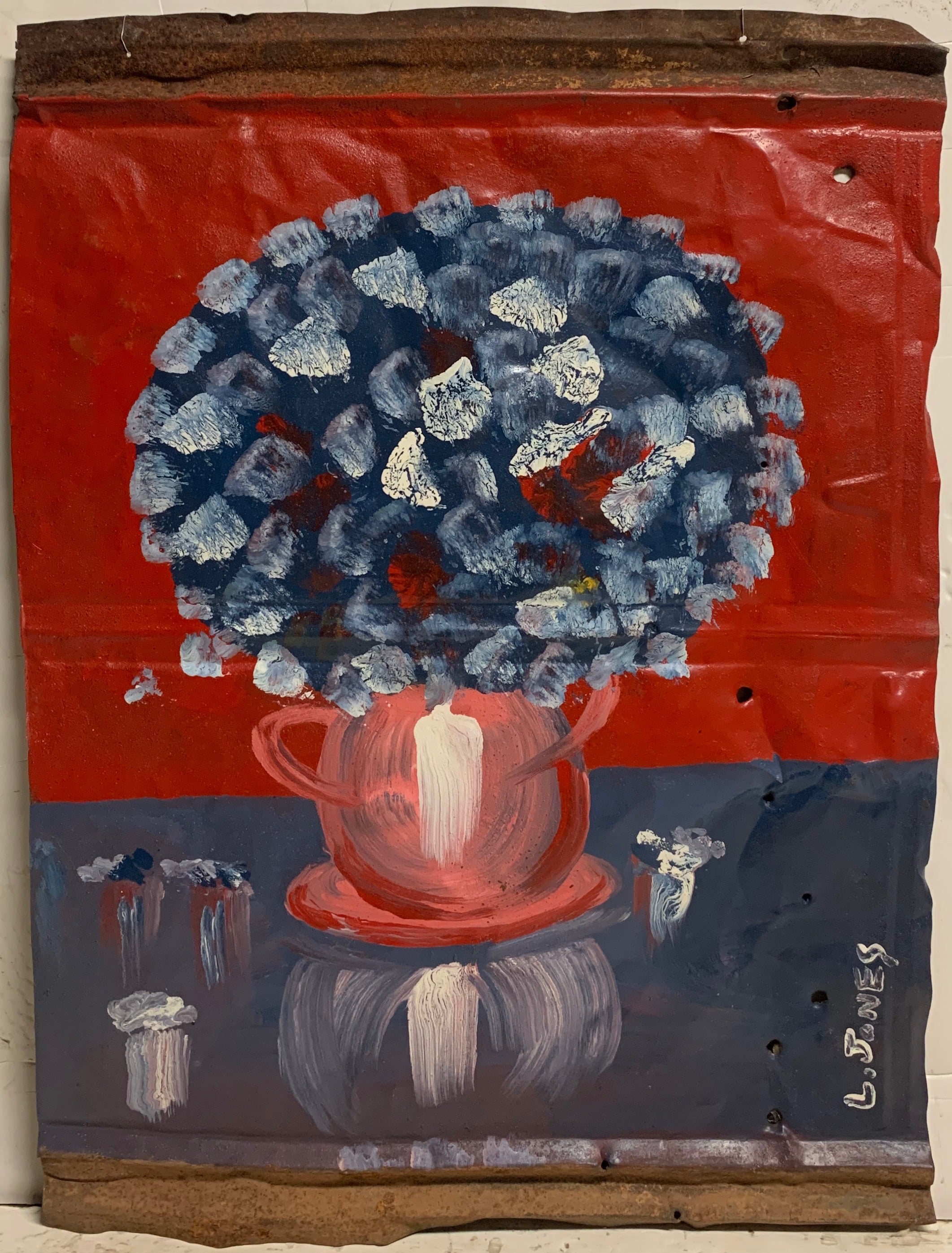 A native Georgian, Leonard Jones taught himself to paint when he was in high school. His works are greatly inspired by scenes from his childhood, images of rural living in the South including housewives, church-goers, and laborers. A folk artist who is often considered an outsider, Jones paints to capture candid daily life and the beauty found in the community around him.The use of scrap wood or tin roofing alludes to the buildings he grew up with, and he often incorporates these materials into the paintings themselves. The materials are covered in bold backgrounds of color, which Jones paints subjects over using his fingers or the handles of brushes, leaving a distinctly Leonard Jones work of art.