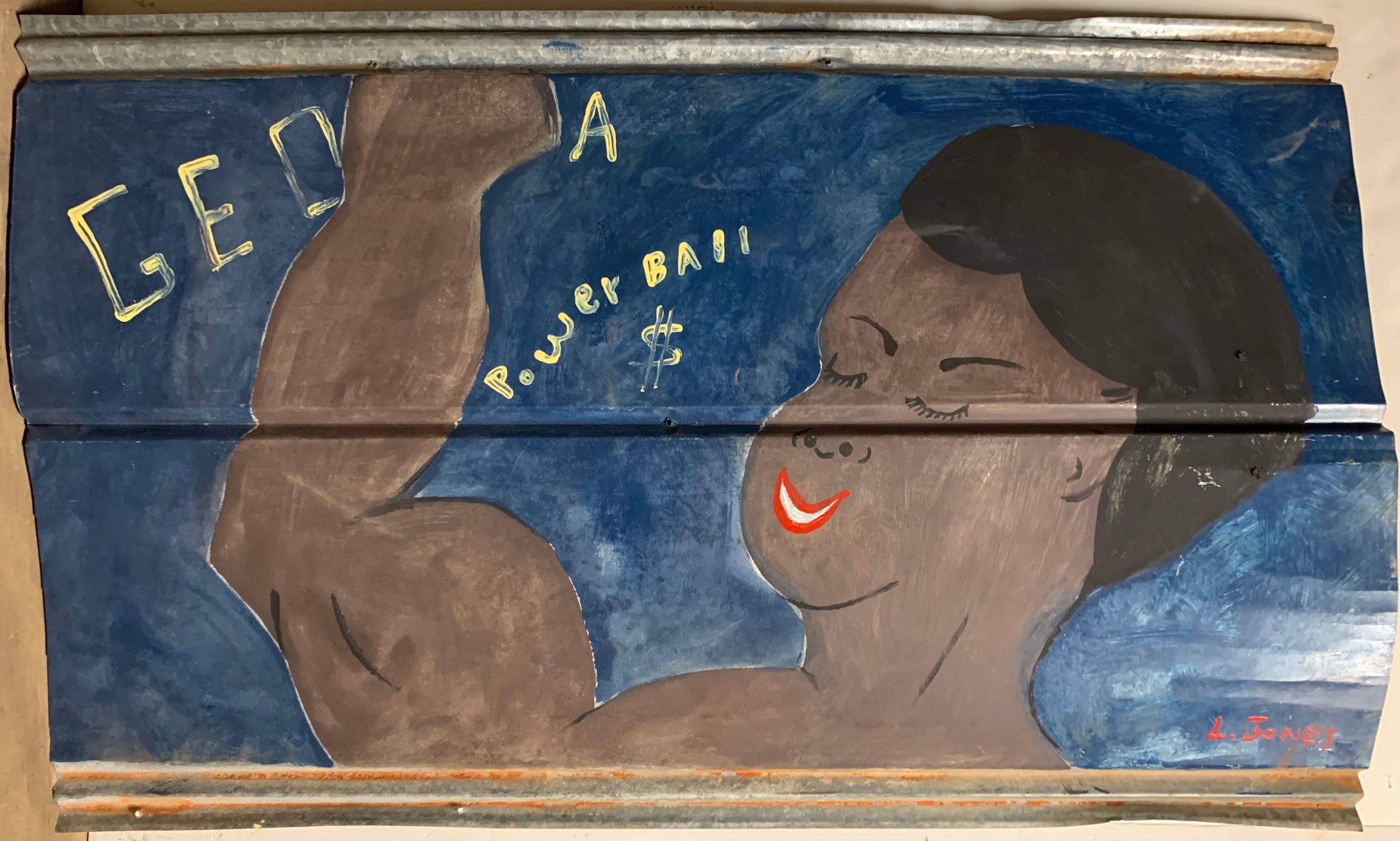 Leonard Jones taught himself to paint when he was in high school. His works are greatly inspired by scenes from his childhood, images of rural living in the South including housewives, church-goers, and laborers. A folk artist who is often considered an outsider, Jones paints to capture candid daily life and the beauty found in the community around him.The use of scrap wood or tin roofing alludes to the buildings he grew up with, and he often incorporates these materials into the paintings themselves. The materials are covered in bold backgrounds of color, which Jones paints subjects over using his fingers or the handles of brushes, leaving a distinctly Leonard Jones work of art.