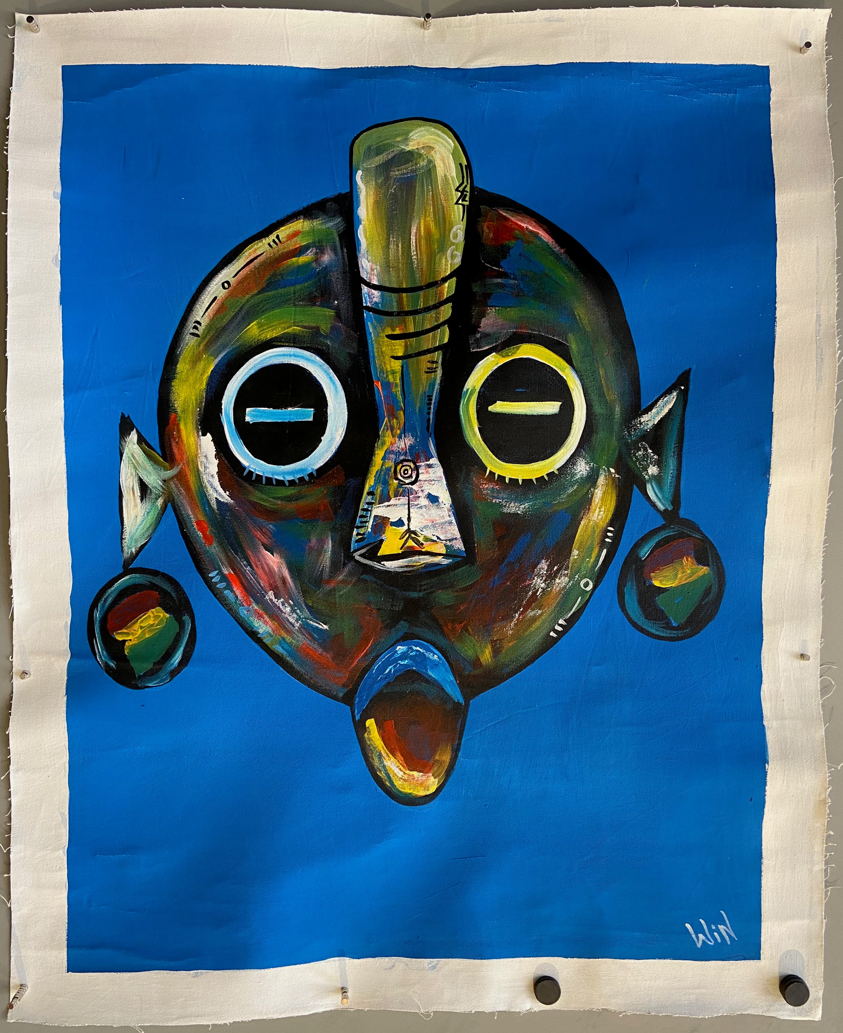 Original painting by the artist Winfred from Accra, Ghana. The painting features a gorgeously colored Ghanaian mask, its patterns and shapes stunning in their immediacy.