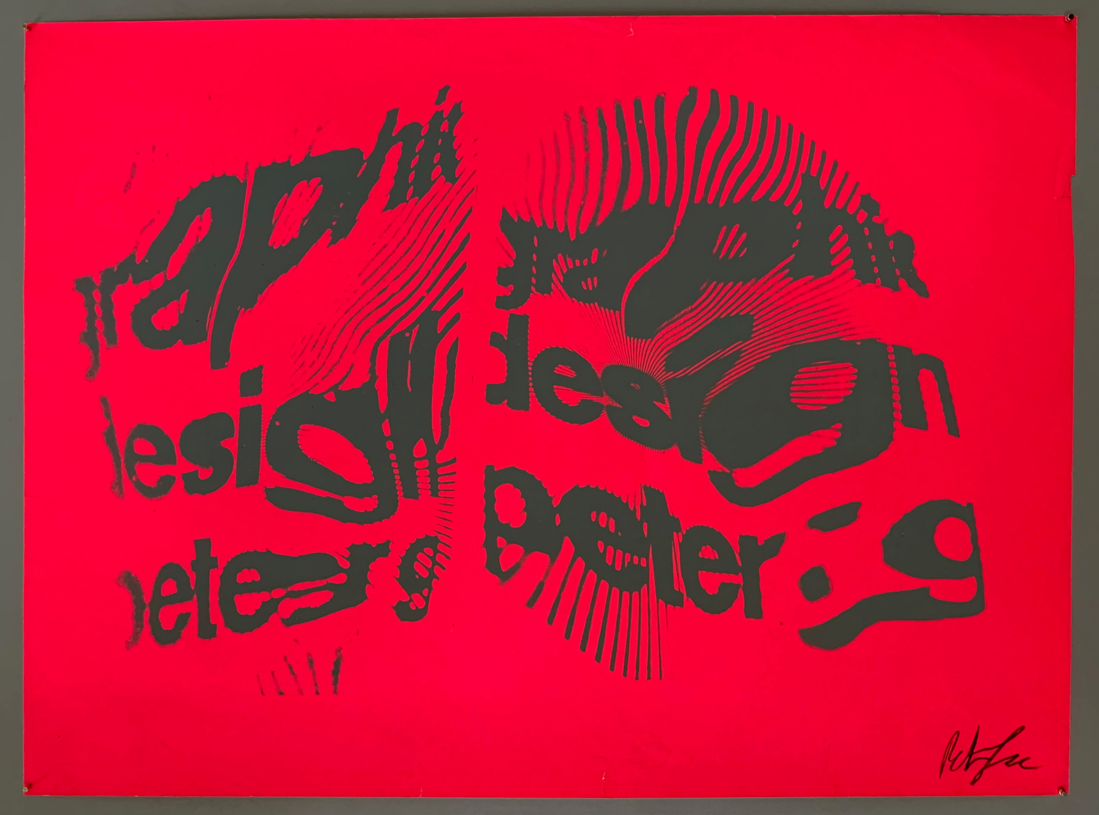 Original silkscreen print by artist Peter Gee showing a psychedelic logo for his design studio. The words are distorted by what looks like two fingerprints. The bright pink and grey make this all the more eye-catching. This play on his last name, writing G instead of Gee, was used in many of his designs, though his signature, found at the bottom right, says "Gee."
