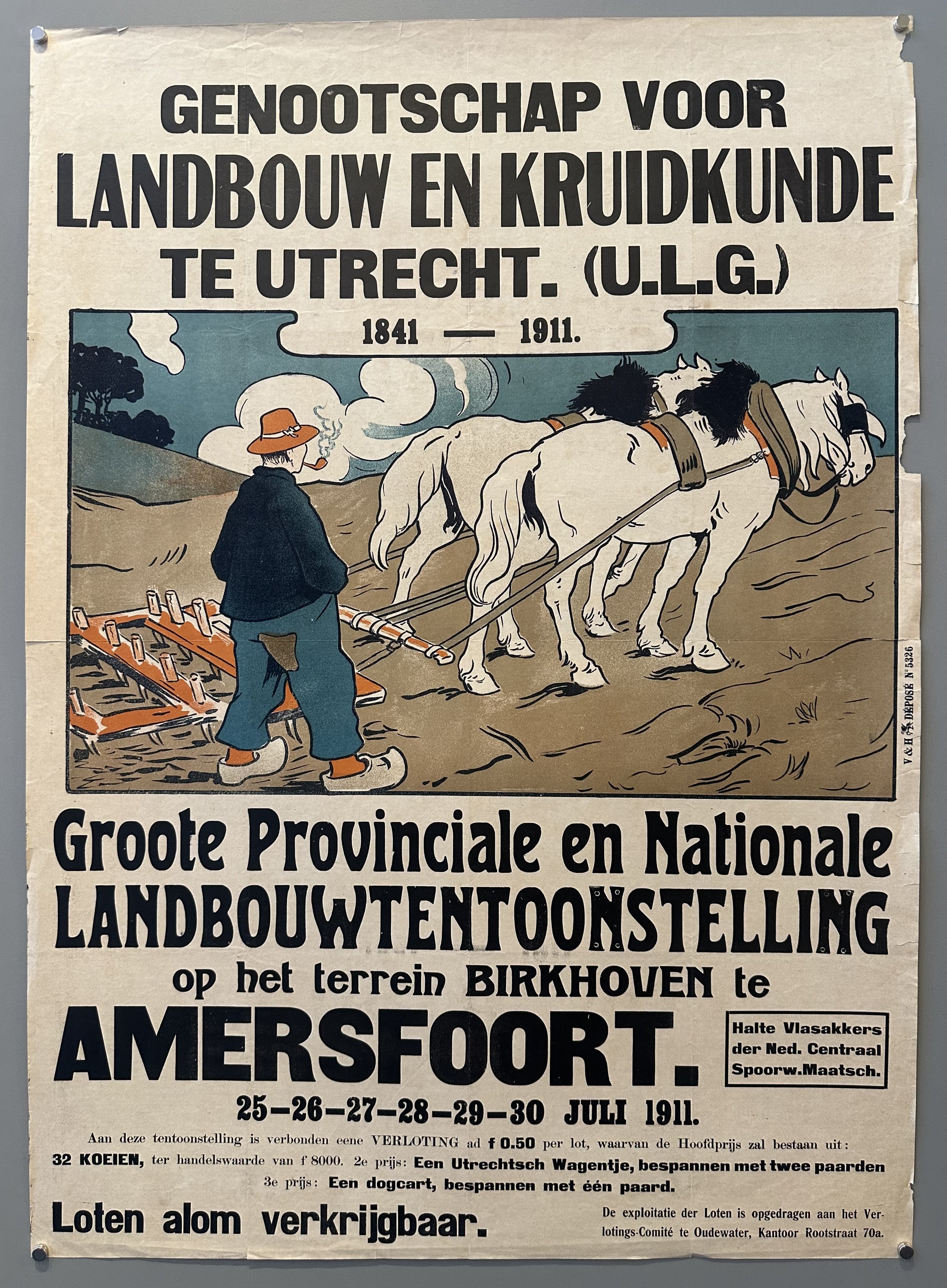 English translation: "Society for Agriculture and Herbalism in Utrecht. (U.L.G.) 1841-1911 / Great Provincial and National Agricultural Exhibition on the grounds of Birkhoven in Amsersfoort. / Vlasakkers stop of the Dutch Central Railway Company"