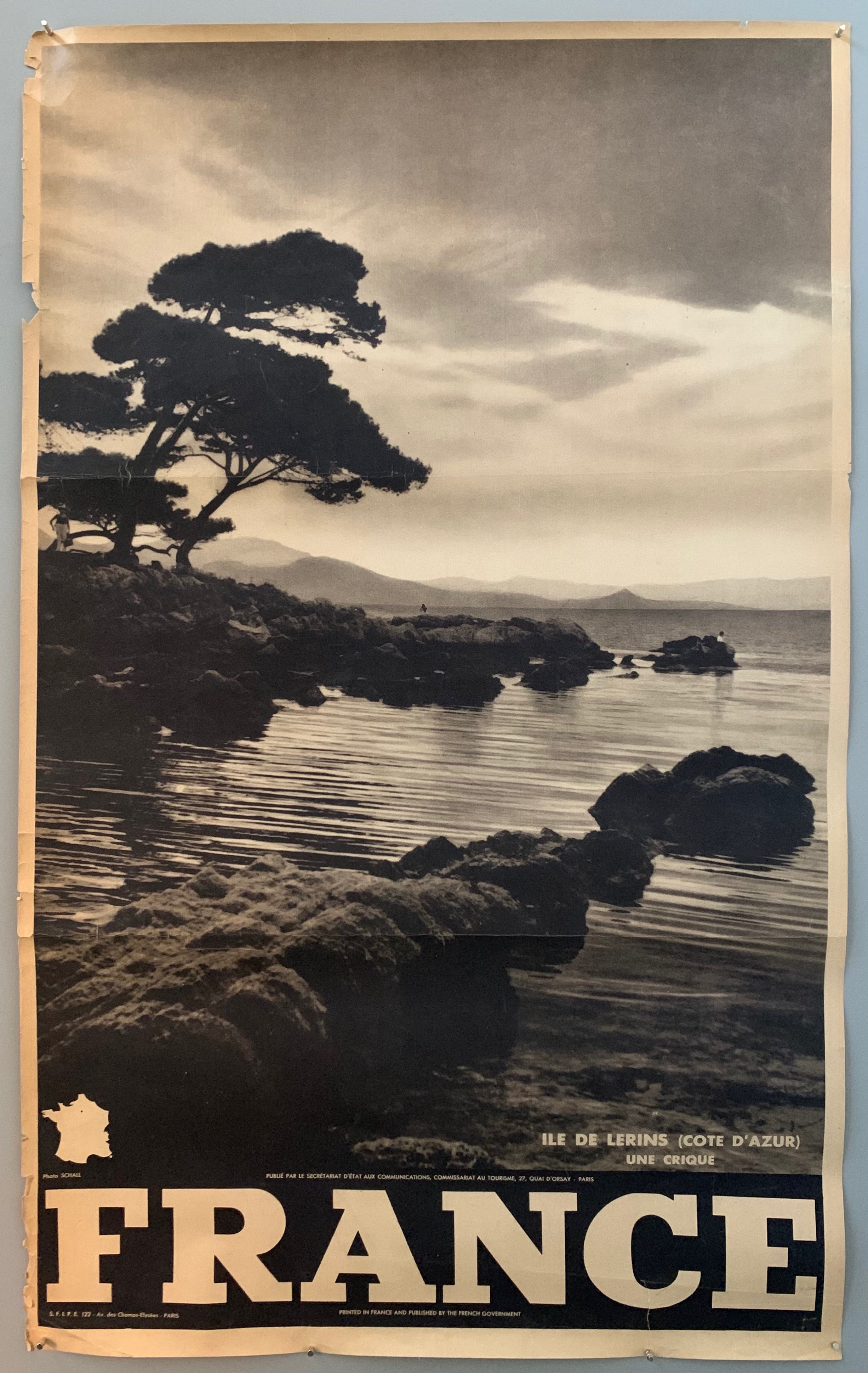 This sepia-toned travel poster was part of a series done to promote tourism across all the regions of France. This stunning image advertises islands off of the French Riviera in Cannes. There are four of these islands within this range, all in the Mediterranean Sea. Rocky coves with smooth water and fawning trees makes for an idyllic vacation spot. This picture itself just rewards a sense of inner peace.