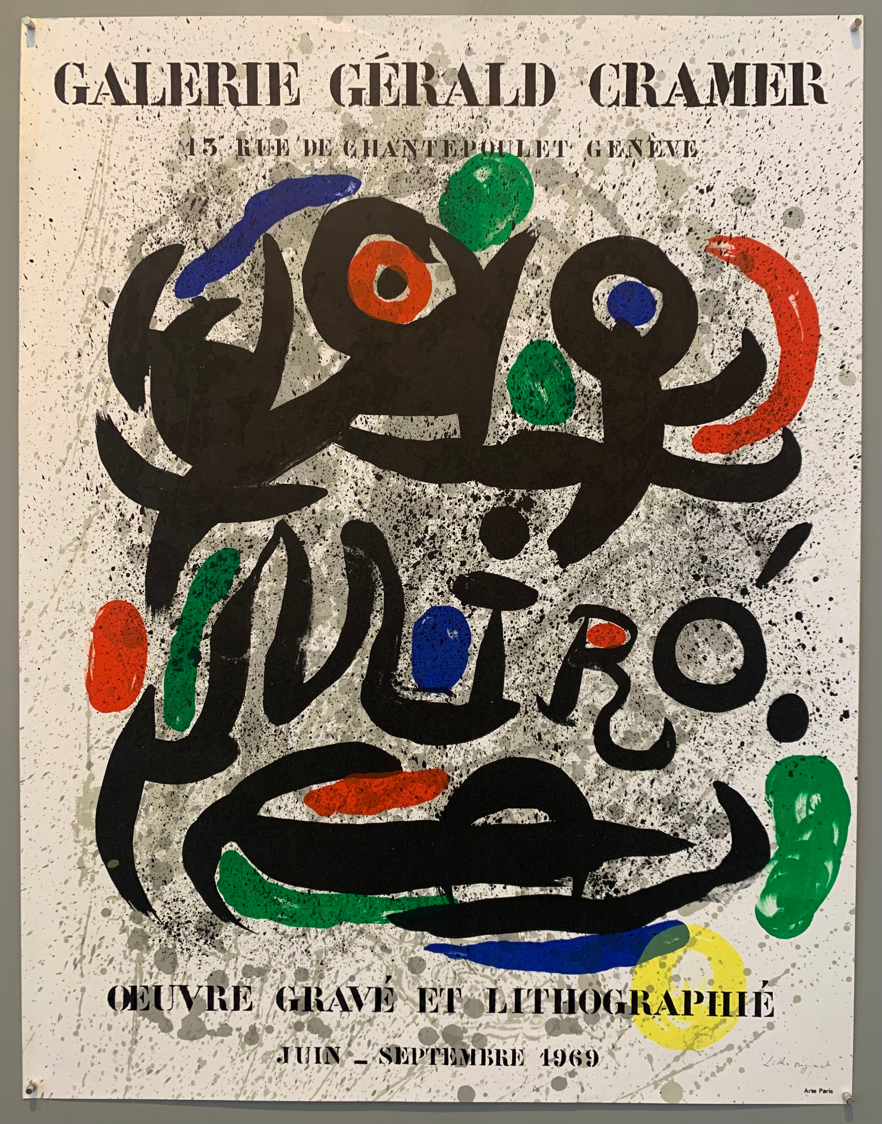 Description: A lovely original lithograph by Miró for an exhibition at the 'Galerie Gérald Cramer'. Miró's signature abstract design and use of color is beautifully displayed here.