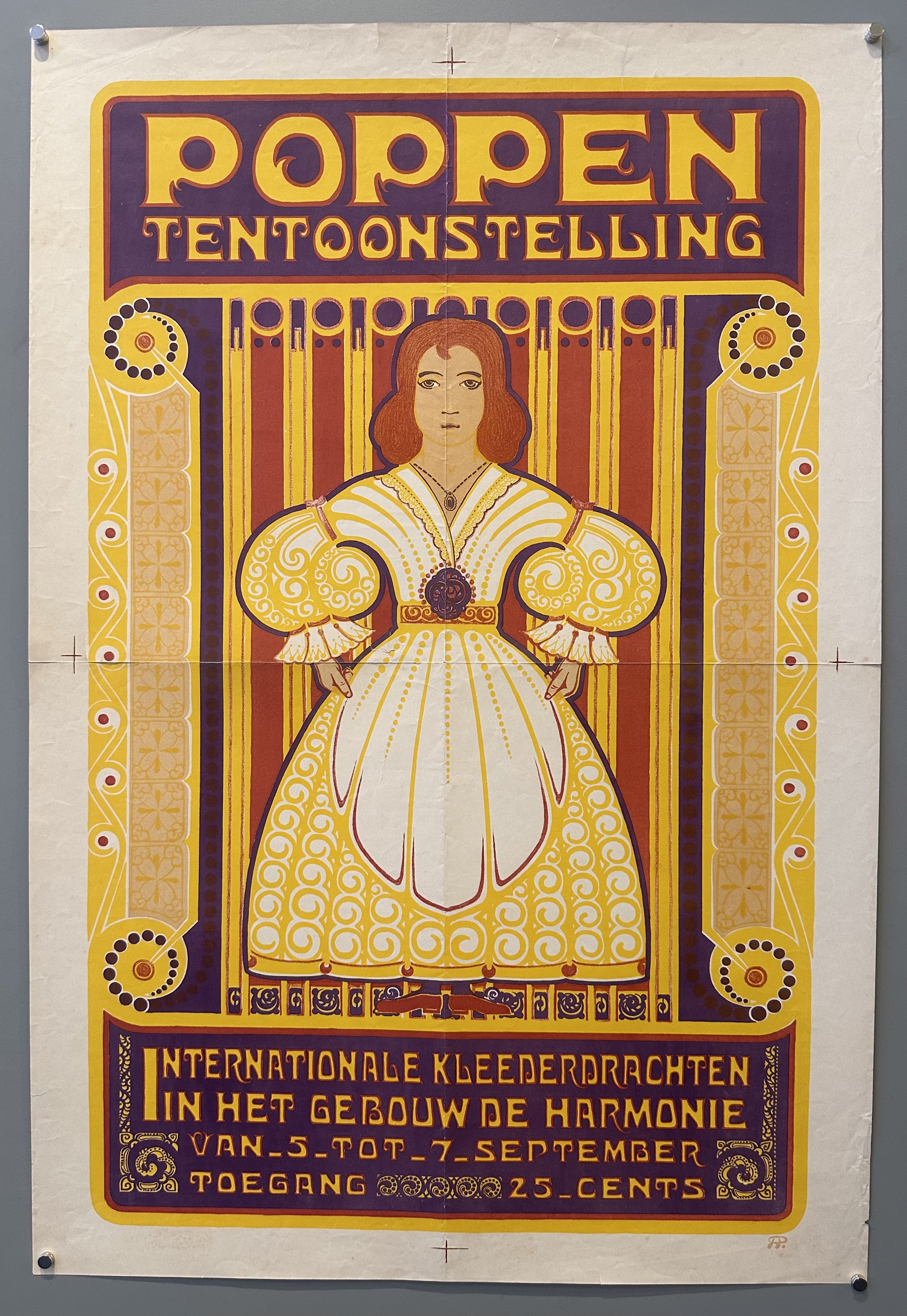 "Poppen Tentoonstelling / Internationale Kleederdrachten in het Gebouw de Harmonie / van 5 tot 7 September / Toegang 25 cents"
