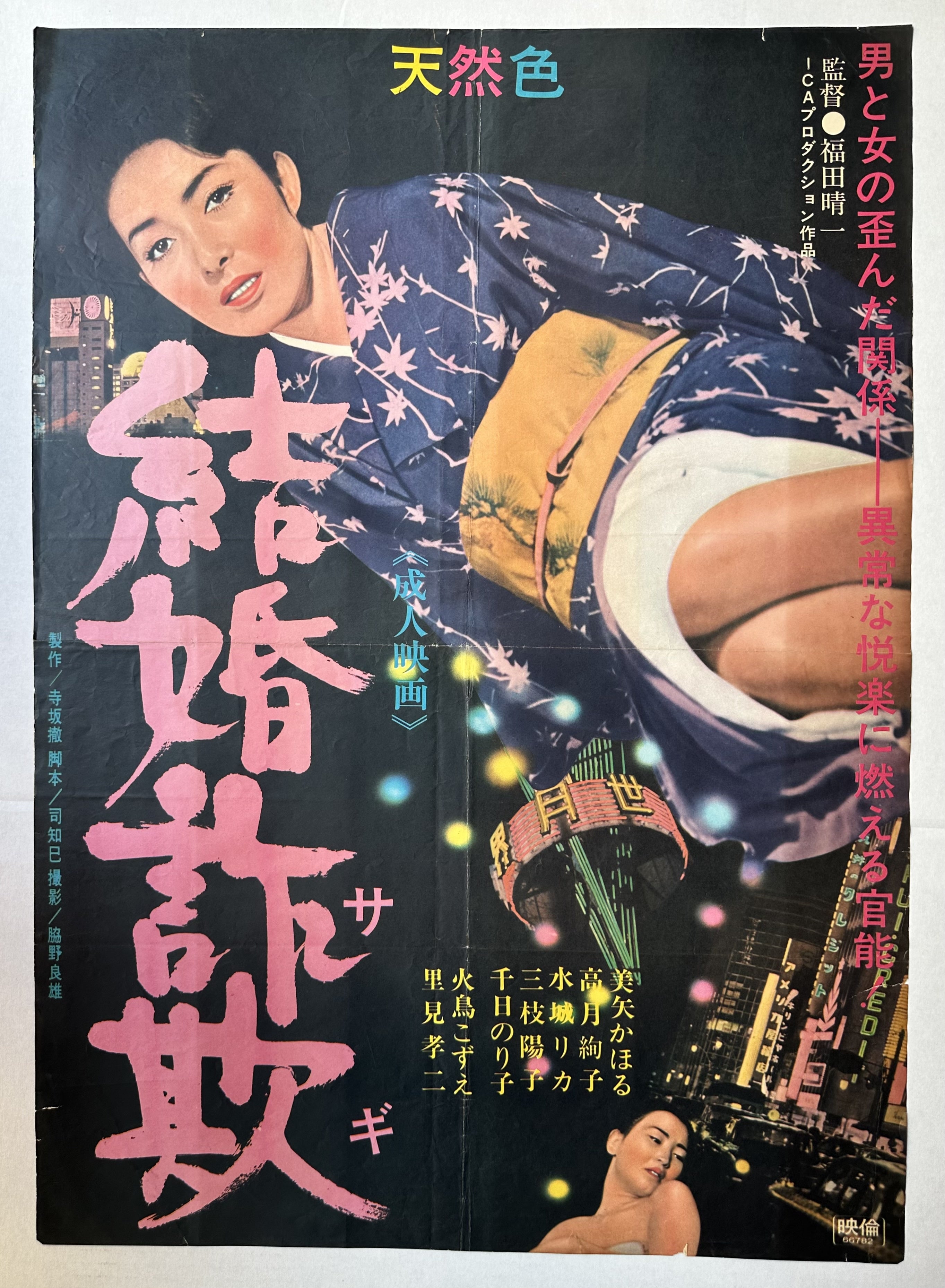 Poster for movie Kekkon Sagi, directed by Seiichi Fukuda and starring Kaoru Miya, Junko Takatsuki, and Rika Mizuki. The poster specifies that this is an Adult movie.