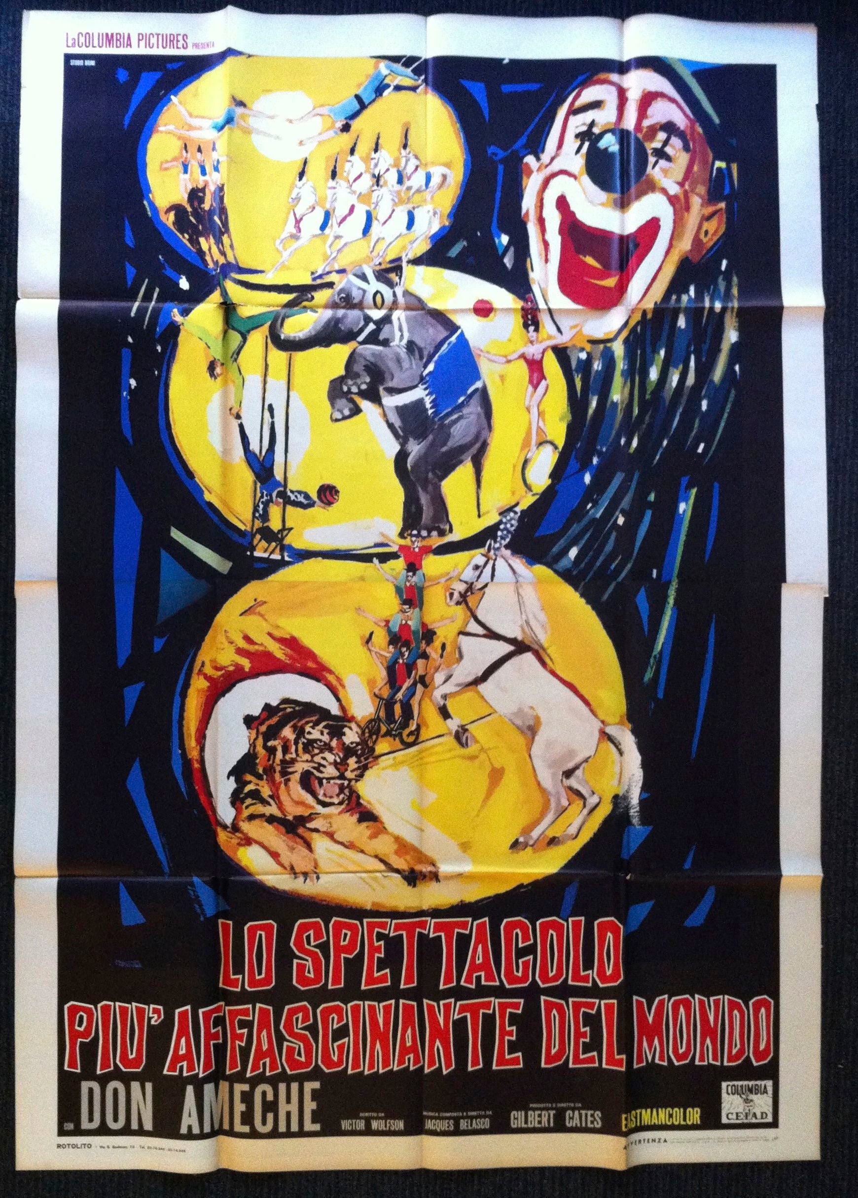 100-250 250-500 acrobatics animals art attacking ball bare chested bicycle biting arm circus circus acts clown documentary elephant film film poster fires flames hoop horse italian italy juggling Large laughing men movie movie poster muscular original posters red rings aropund the world size-39x55 smiling sun tiger vintage vintage posters woman