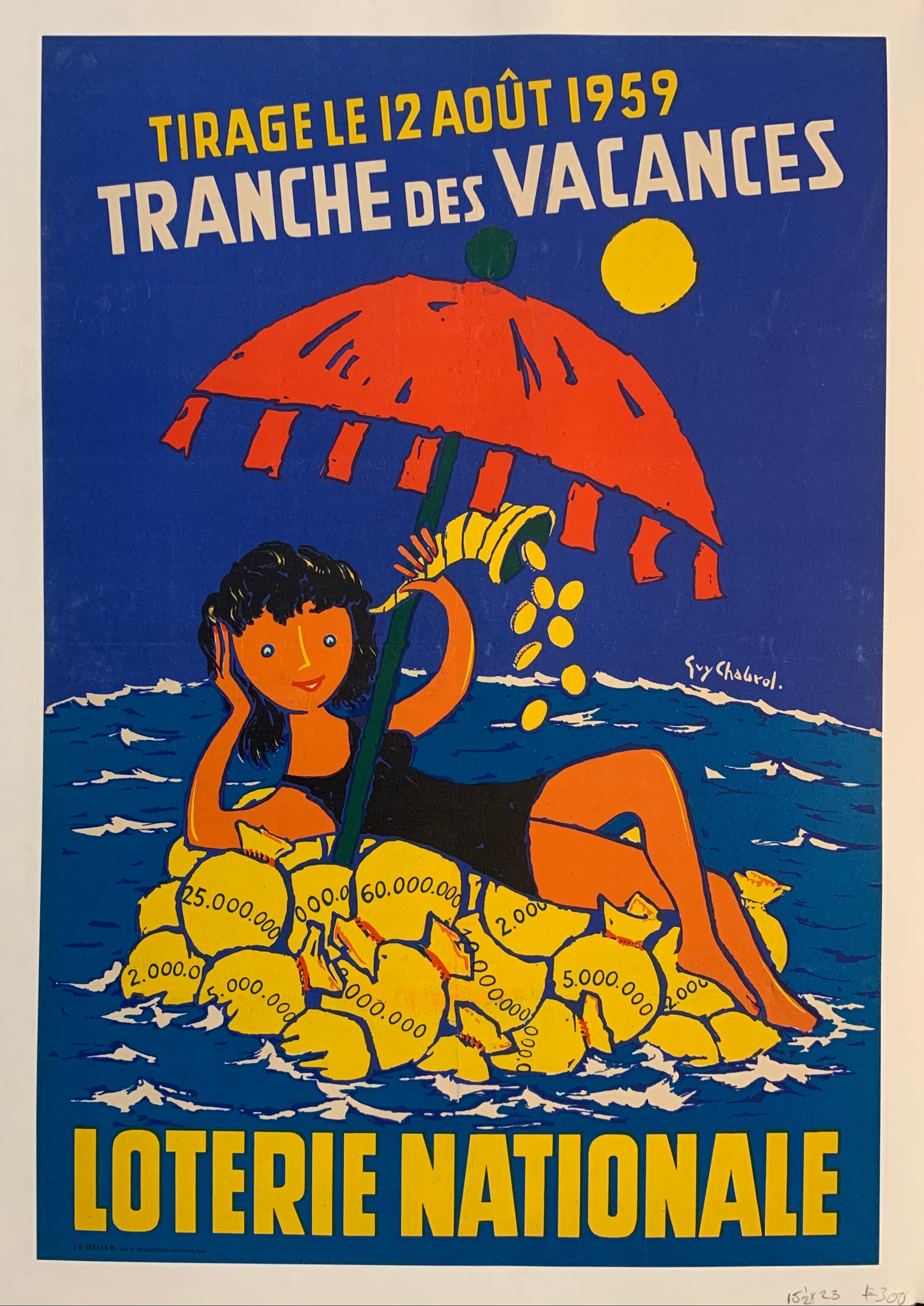 Original vintage poster for France's national lottery. The playful illustration on the poster shows a woman enjoying a sunny day in the beach, relaxing on bags full of her lottery winnings.