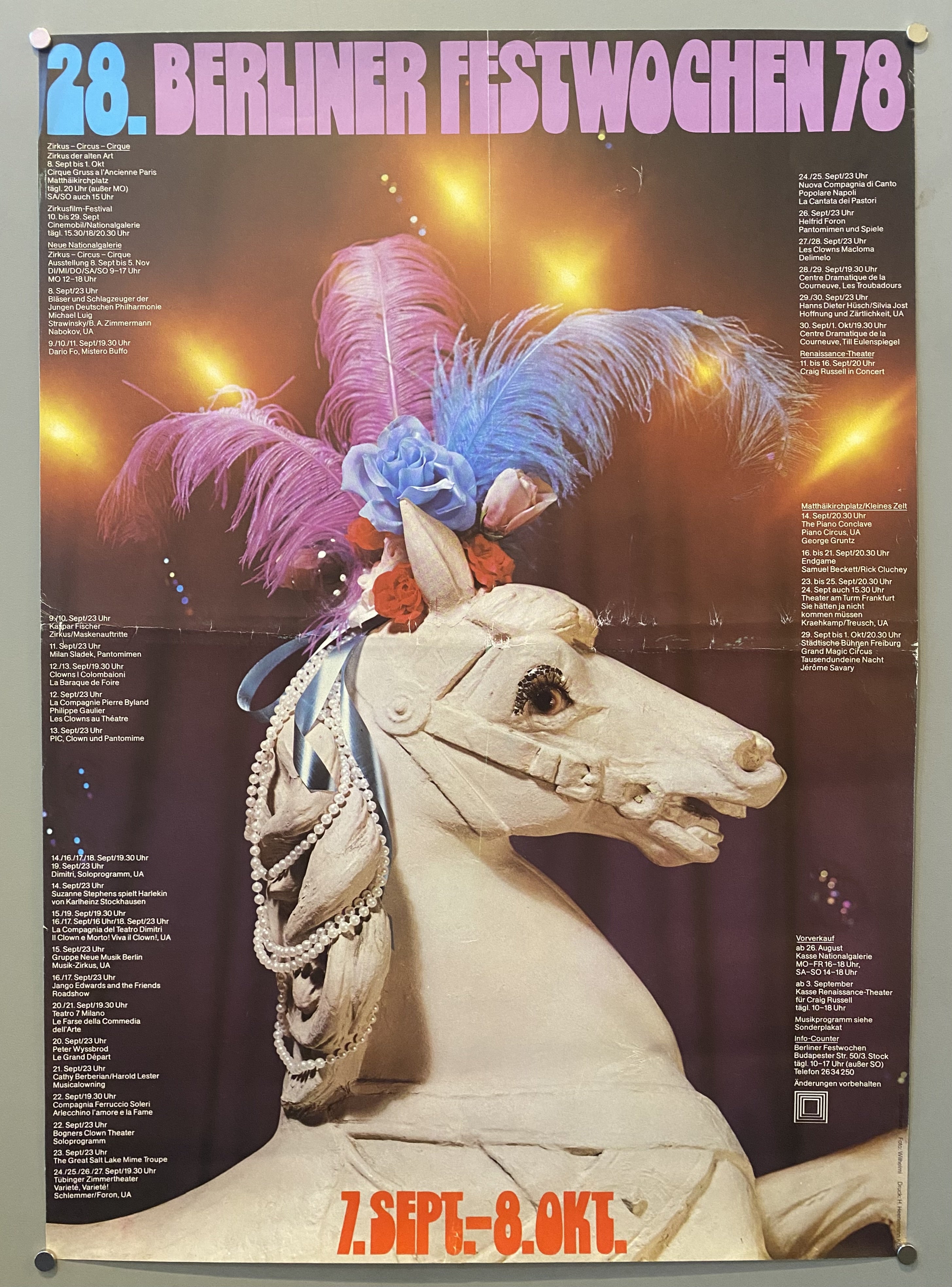 The Berliner Festspiele organise a range of festivals and art exhibitions, concerts, dance and theatre performances, and more. This poster features a close-up of a carousel horse and the festival's scheduled activities on both sides.